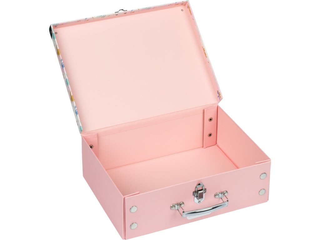 • Skládací kufřík z pevného laminovaného papíru s okovanými rohy.