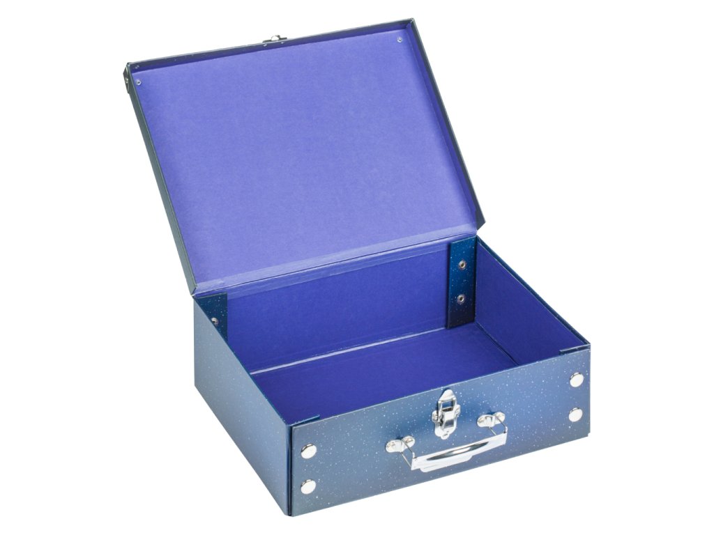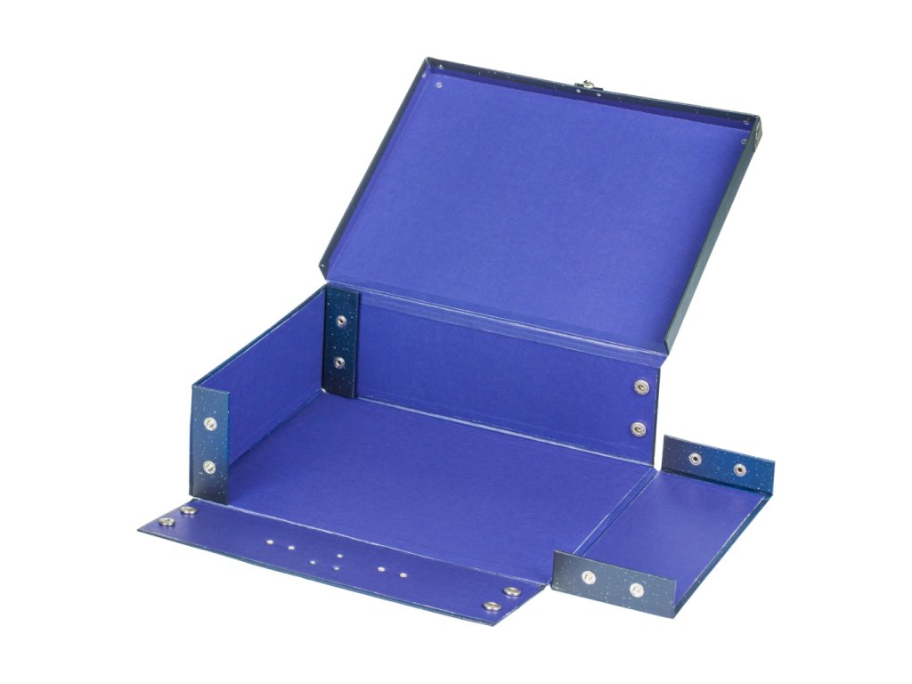 • Skládací kufřík z pevného laminovaného papíru s okovanými rohy.