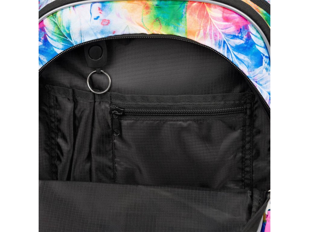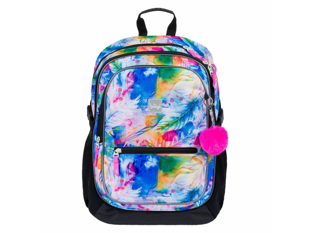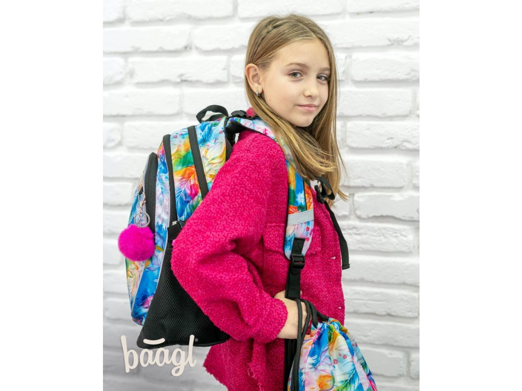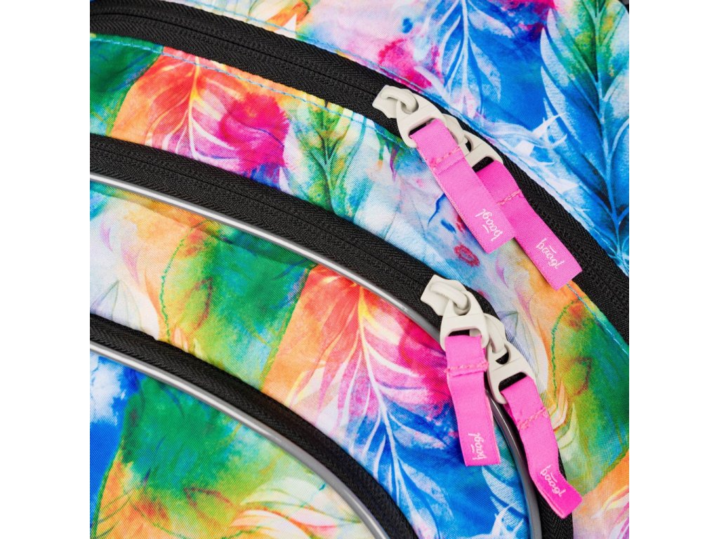 Školní batoh Baagl Core Akvarel je vymakaný do posledního detailu. Má 3 samostatné komory na zip. V té zadní je kapsa na 15 palcový notebook či tablet a v té přední kapsa na drobnosti a na tužky. Nechybí ani poutko na klíče a schované překvapení v podobě trendy náramku. V přední části batohu je navíc malá kapsa na zip na drobnosti.