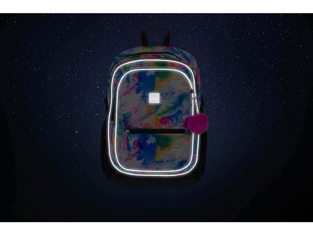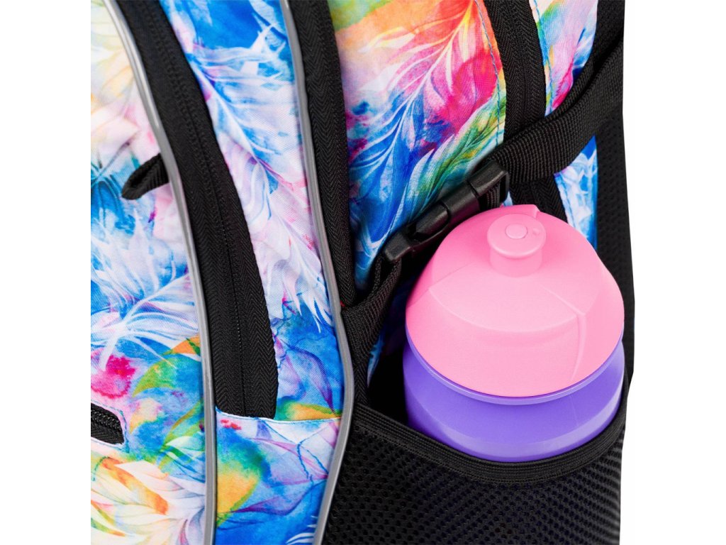 Po bocích jsou dvě síťované kapsy na lahev s přezkou okolo, aby lahev nevypadla. Krásně se do nich vleze jedna z našich lahví. Batoh navíc zdobí trendy přívěsek. Na batohu jsou zakomponovány reflexní prvky pro větší bezpečnost.