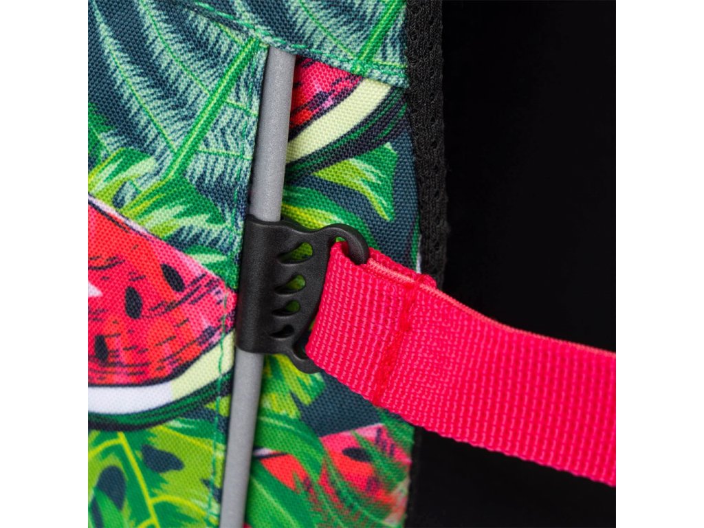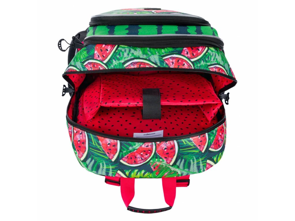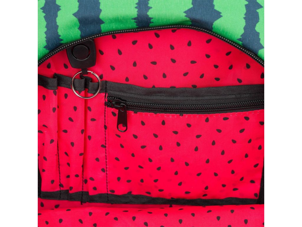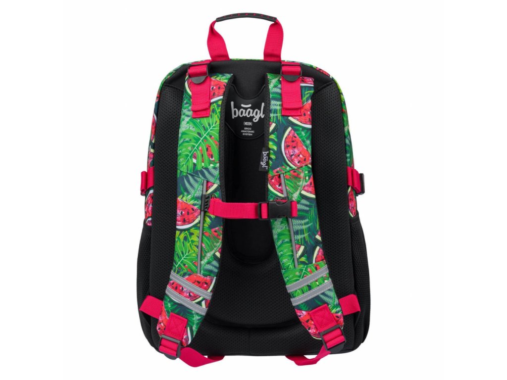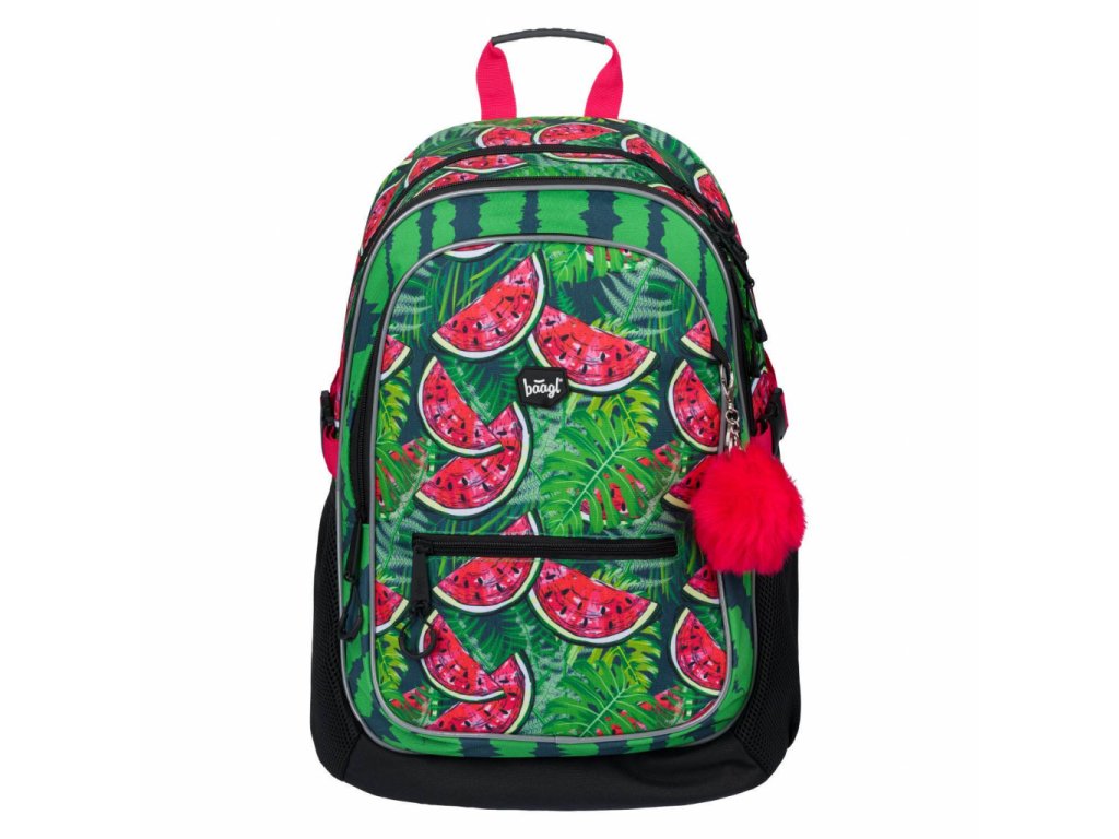 Školní batoh Baagl Core Meloun je vymakaný do posledního detailu. Má 3 samostatné komory na zip. V té zadní je kapsa na 15 palcový notebook či tablet a v té přední kapsa na drobnosti a na tužky. Nechybí ani poutko na klíče a schované překvapení v podobě trendy náramku. V přední části batohu je navíc malá kapsa na zip na drobnosti.