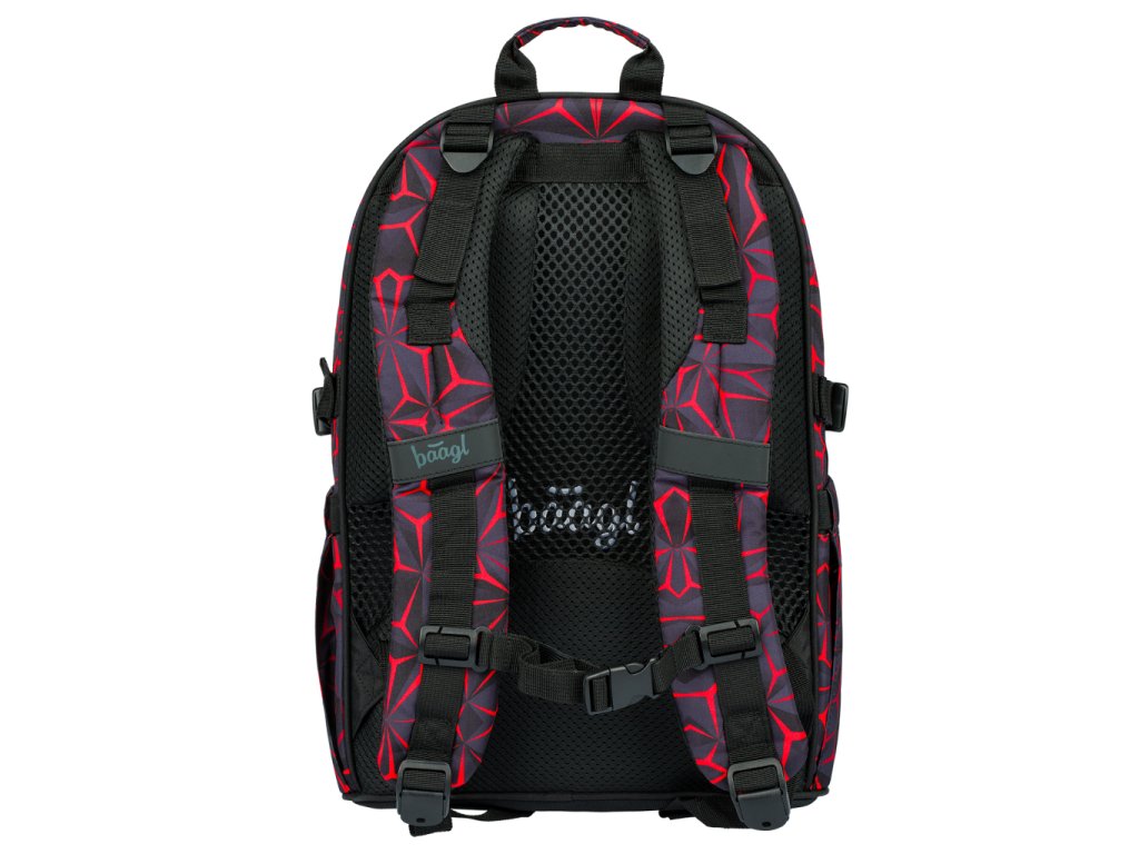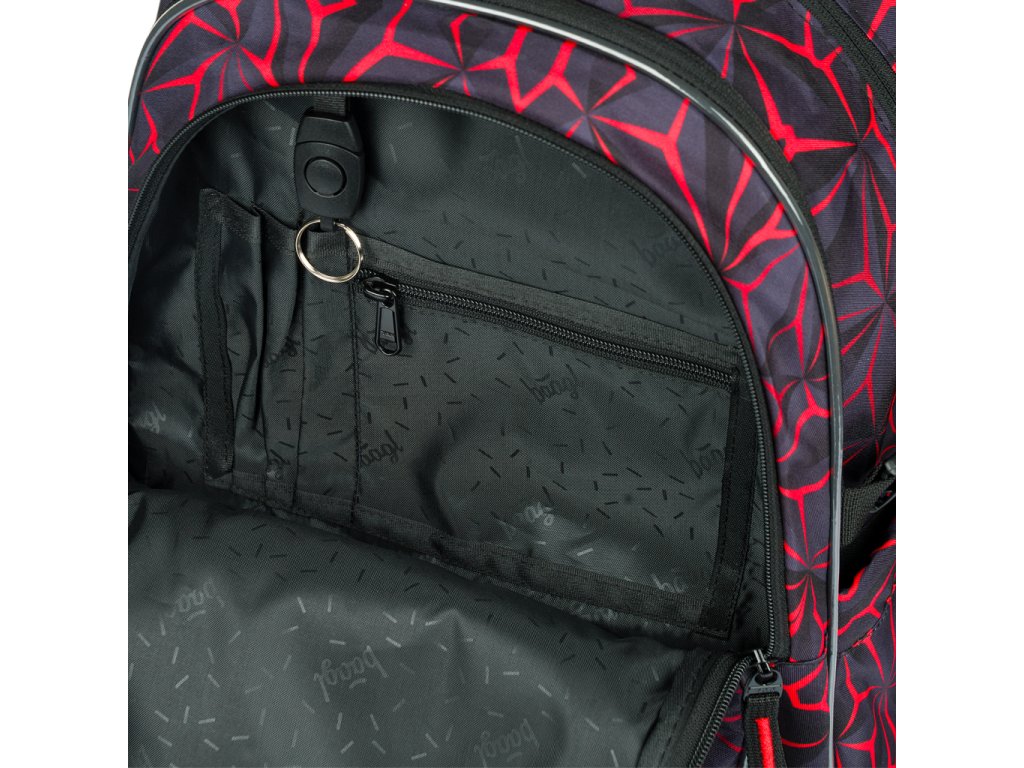 Školní batoh Baagl Core Red Polygon je vymakaný do posledního detailu. Má 3 samostatné komory na zip. V té zadní je kapsa na 15 palcový notebook či tablet a v té přední kapsa na drobnosti a na tužky. Nechybí ani poutko na klíče a schované překvapení v podobě trendy náramku. V přední části batohu je navíc malá kapsa na zip na drobnosti.