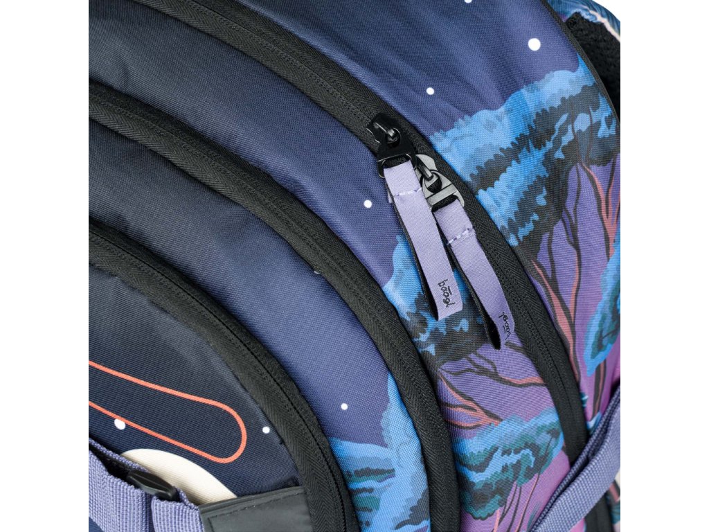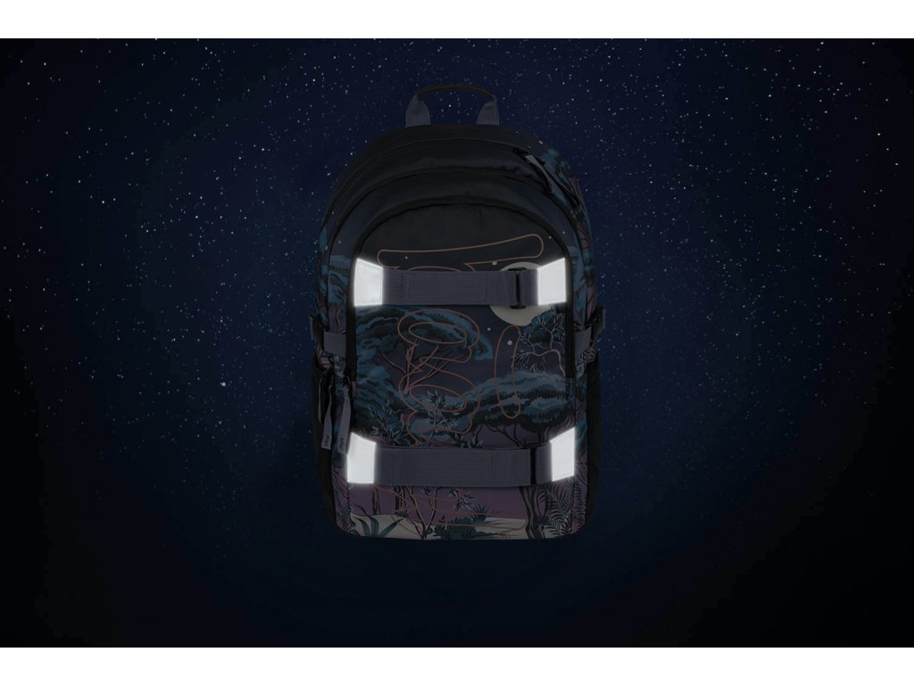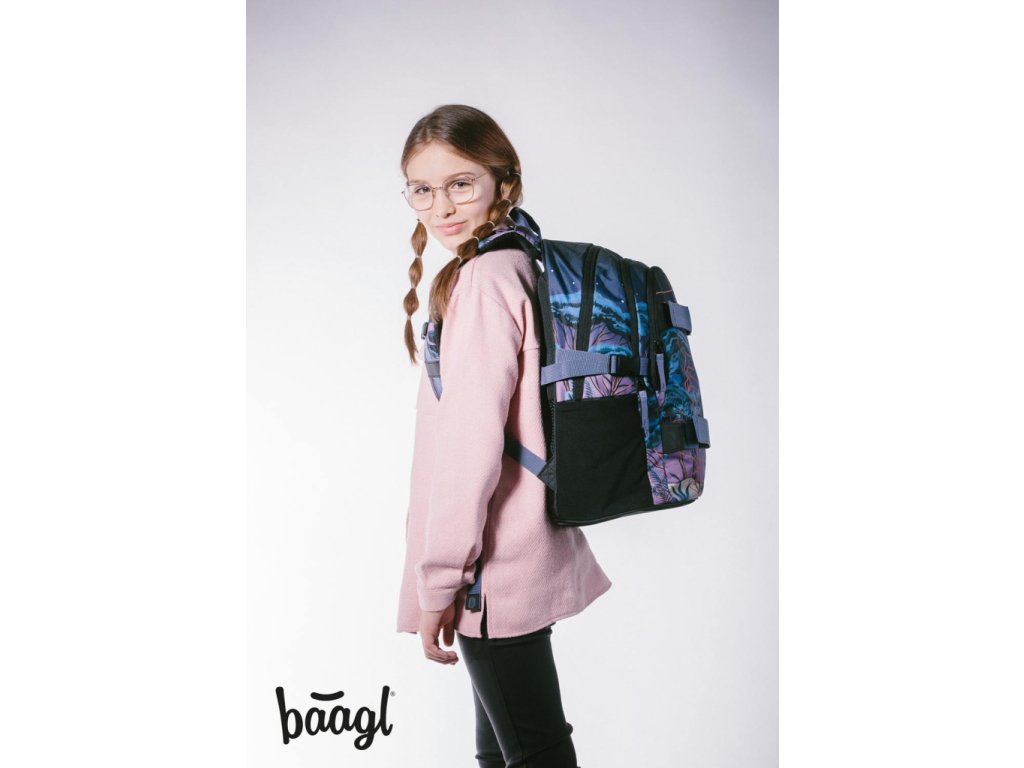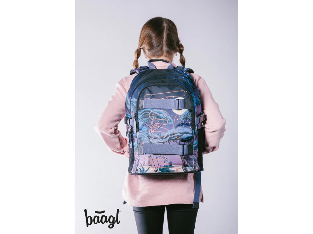 Školní batoh Baagl Skate Night je vymakaný do posledního detailu. Má 3 samostatné komory na zip. V té zadní je kapsa na 15 palcový notebook či tablet a v té přední kapsa na drobnosti a na tužky. Nechybí ani poutko na klíče.