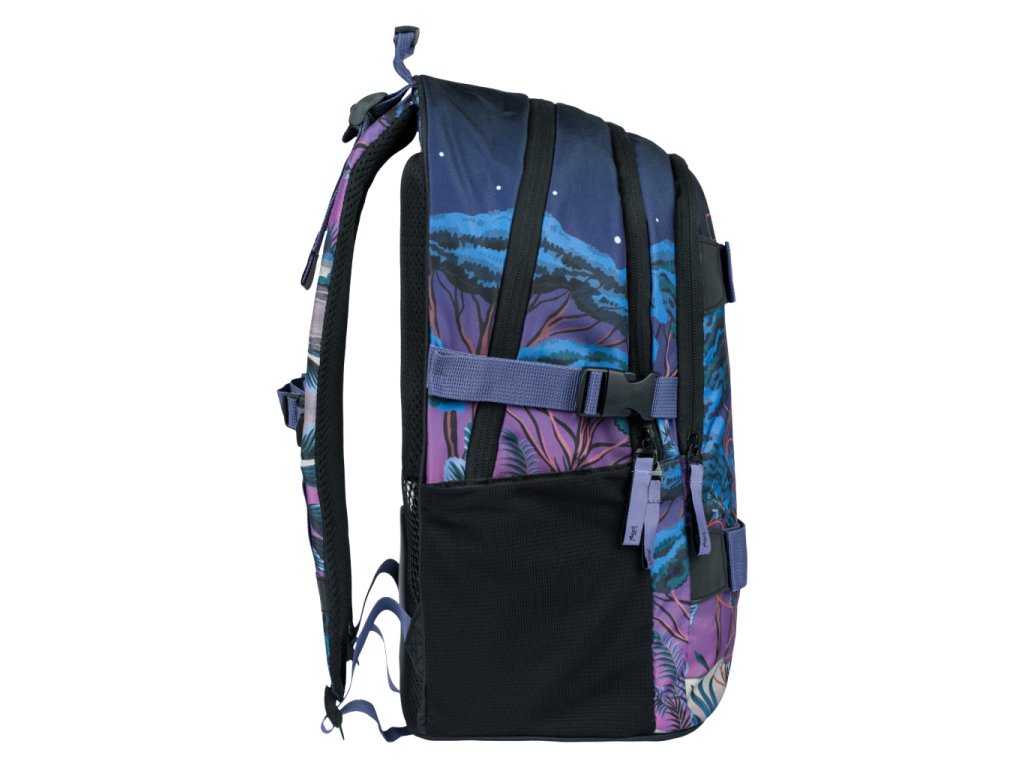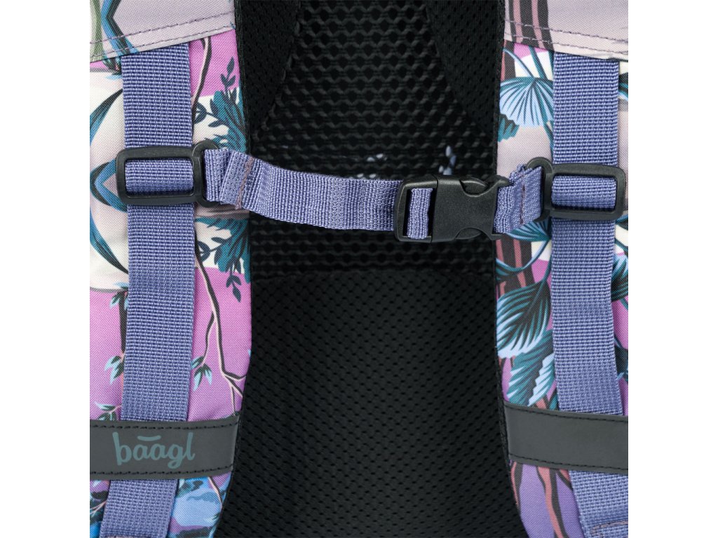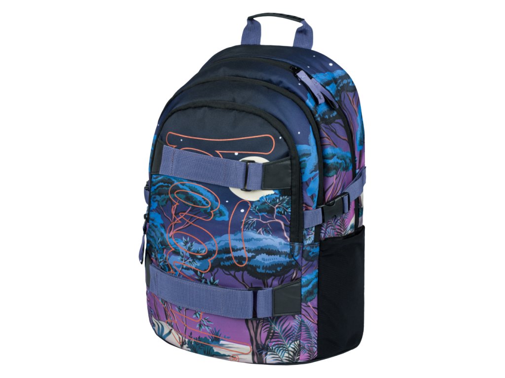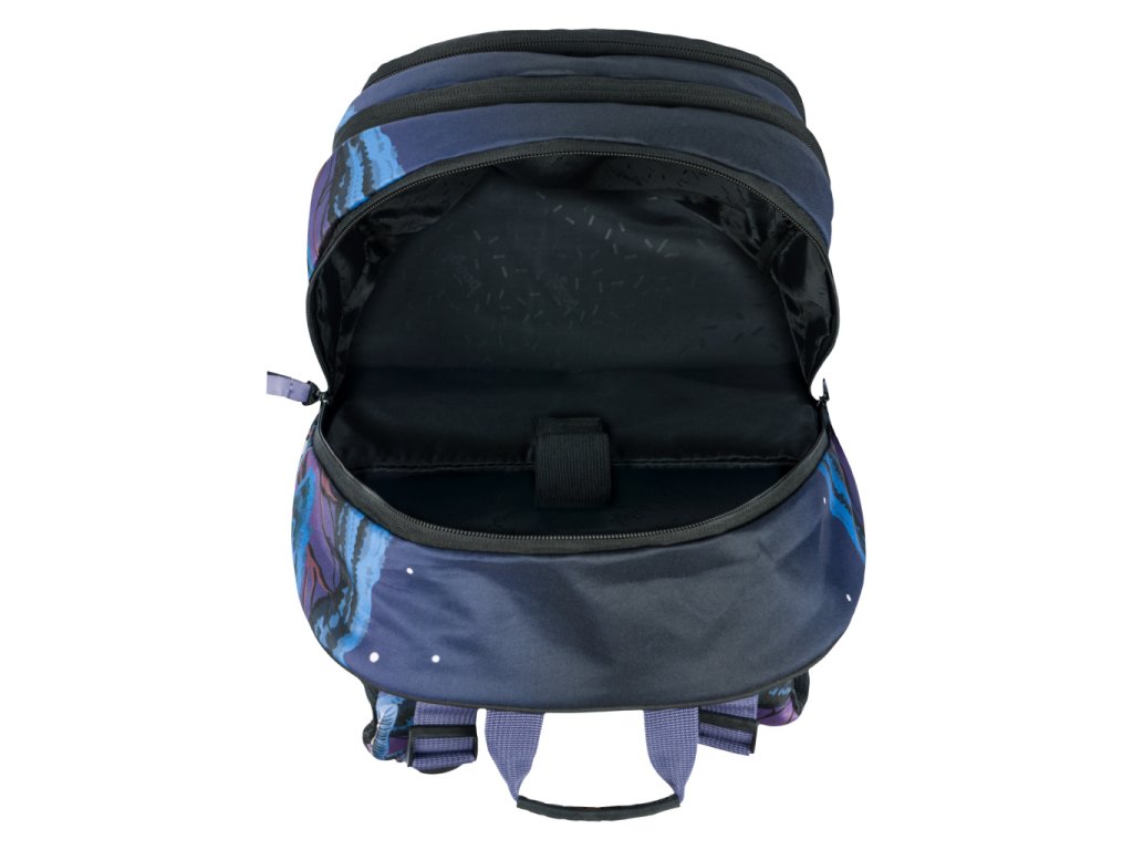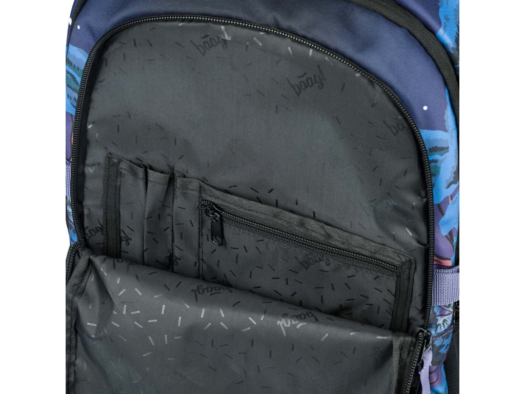 Školní batoh Baagl Skate Night je vymakaný do posledního detailu. Má 3 samostatné komory na zip. V té zadní je kapsa na 15 palcový notebook či tablet a v té přední kapsa na drobnosti a na tužky. Nechybí ani poutko na klíče.