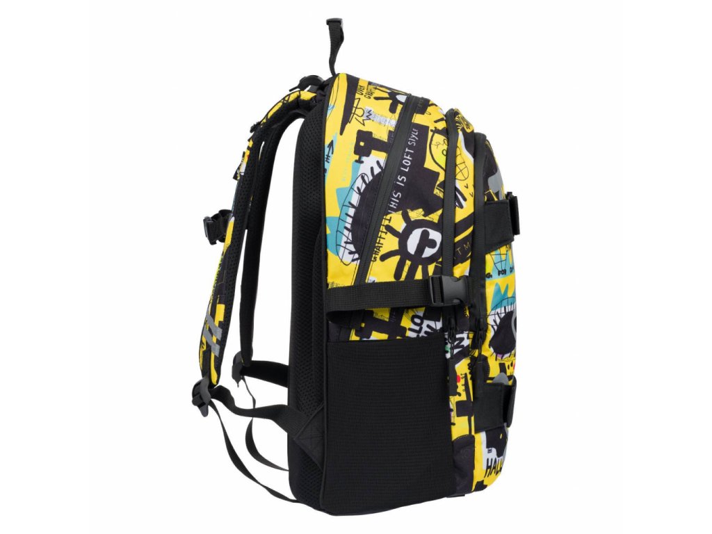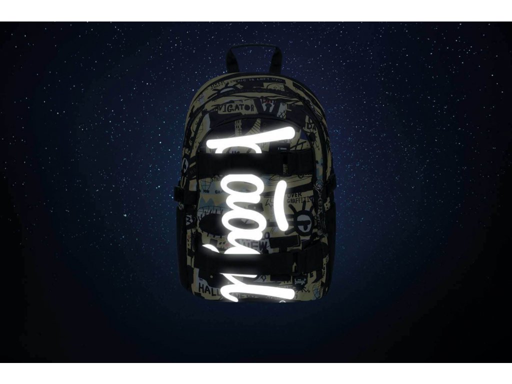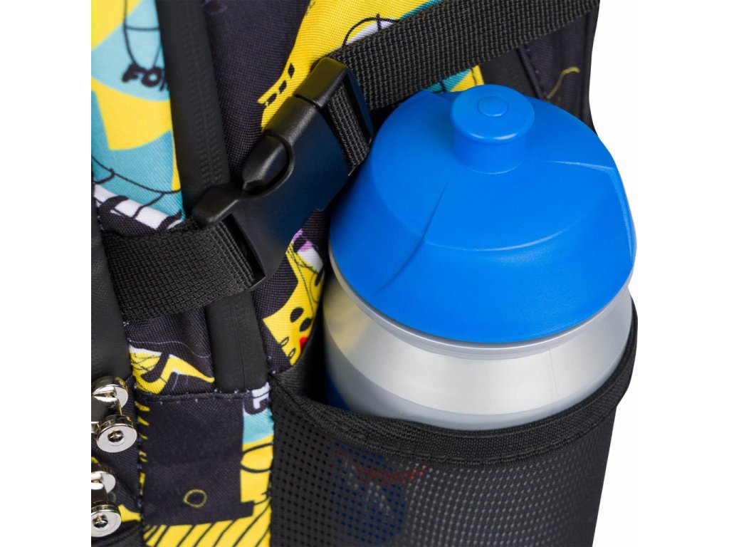 Po bocích jsou dvě síťované kapsy na lahev a krásně se do nich vleze jedna z našich lahví. V přední části batohu jsou dva popruhy na přichycení skateboardu. Batoh navíc zdobí trendy kovový přívěsek skatu. Na batohu jsou zakomponovány reflexní prvky pro větší bezpečnost.