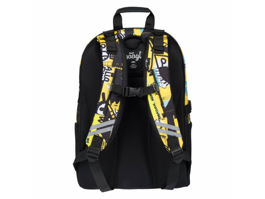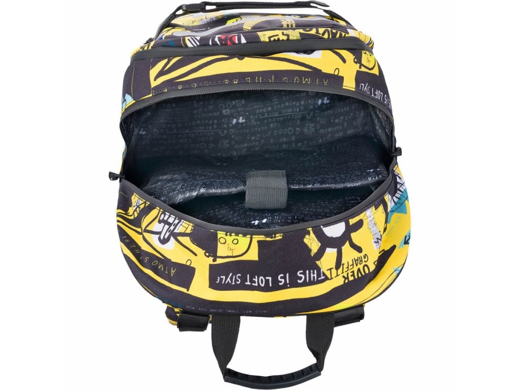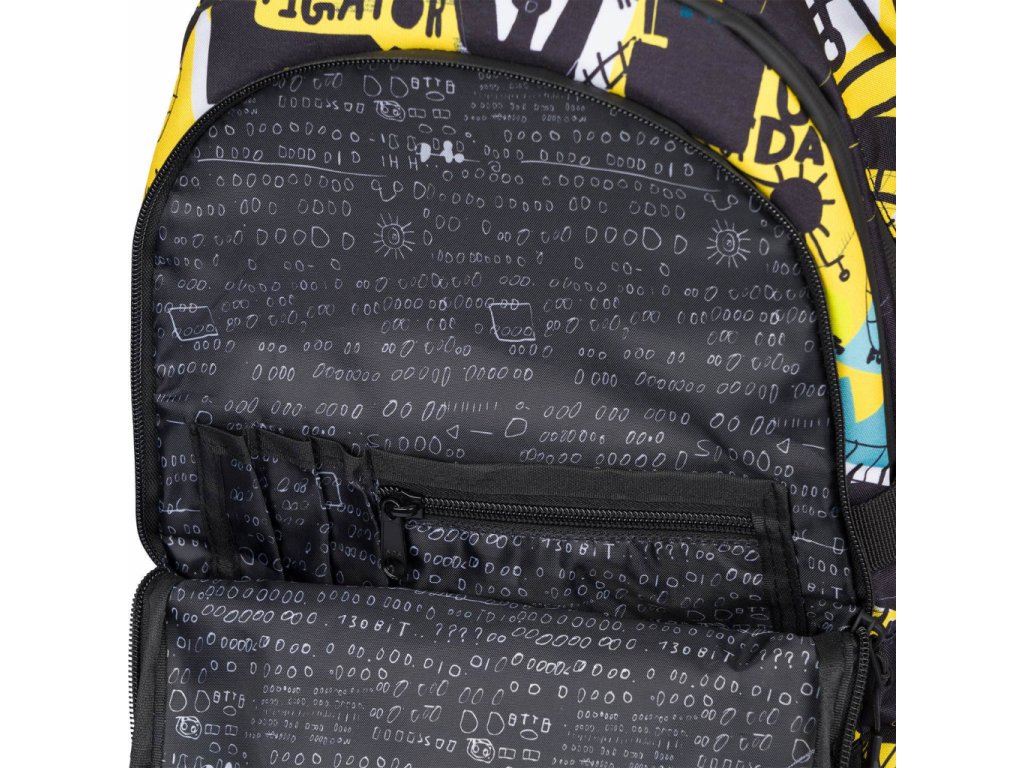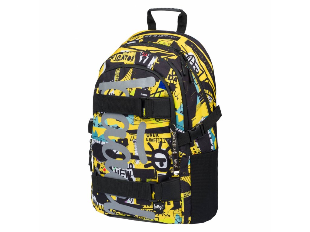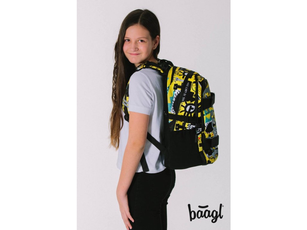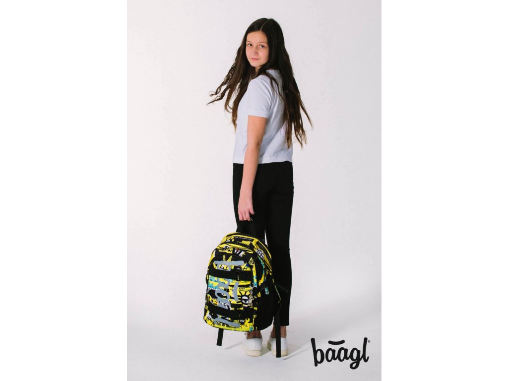 Školní batoh Baagl Skate Street Art je vymakaný do posledního detailu. Má 3 samostatné komory na zip. V té zadní je kapsa na 15 palcový notebook či tablet a v té přední kapsa na drobnosti a na tužky. Nechybí ani poutko na klíče.