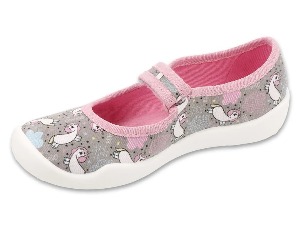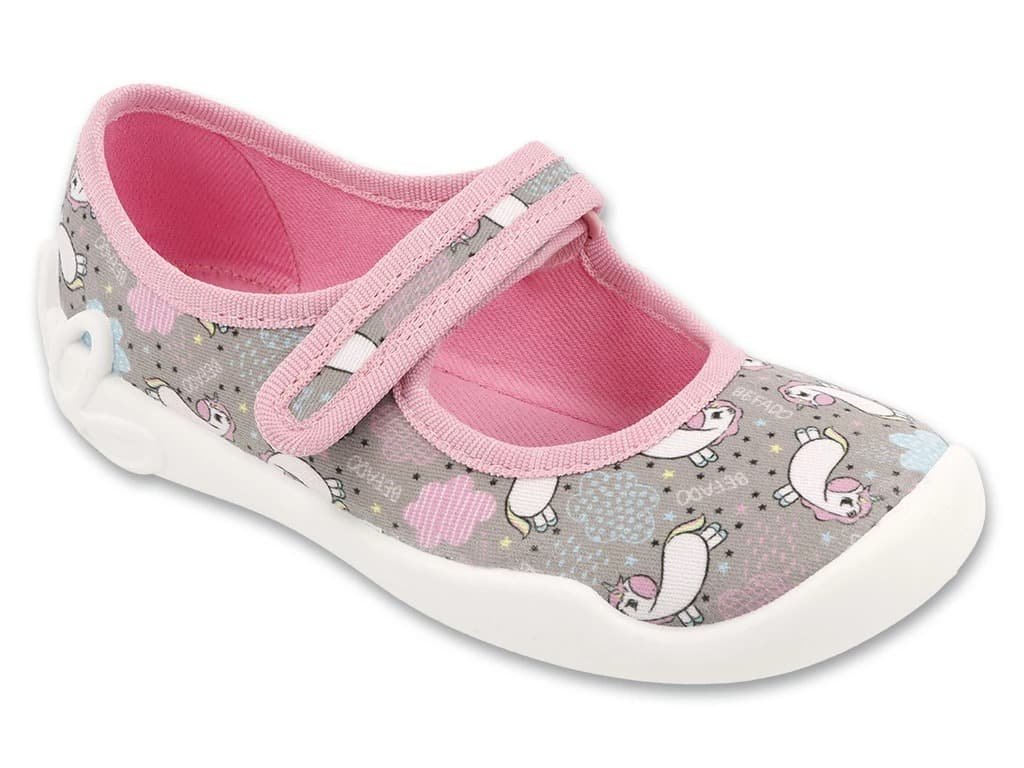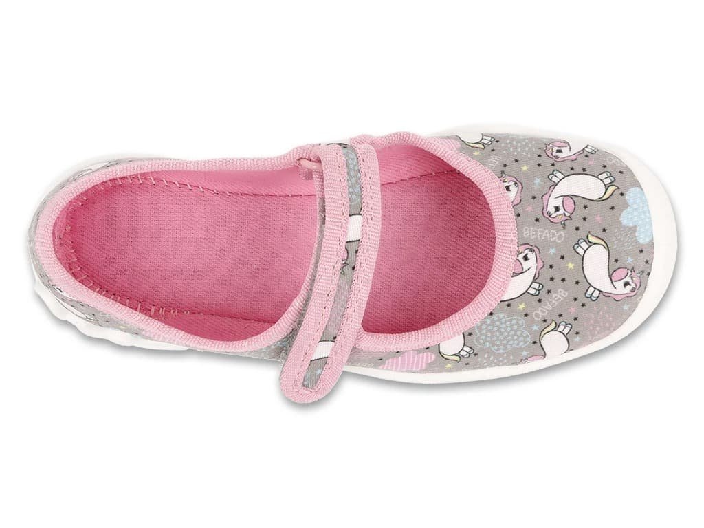 Dívčí papuče Bačkory Befado 114X567 Jednorožci v růžové barvě, jsou skvělé do školky, školy i na doma. Jsou tvořeny prodyšnou textílií a mají bílou podrážku s ventilačními otvory. Díky suchému zipu se bačkory snadno nazouvají a jdou krásně přizpůsobit i na vyší nárt. Sednou na průměrné i užší nožky.