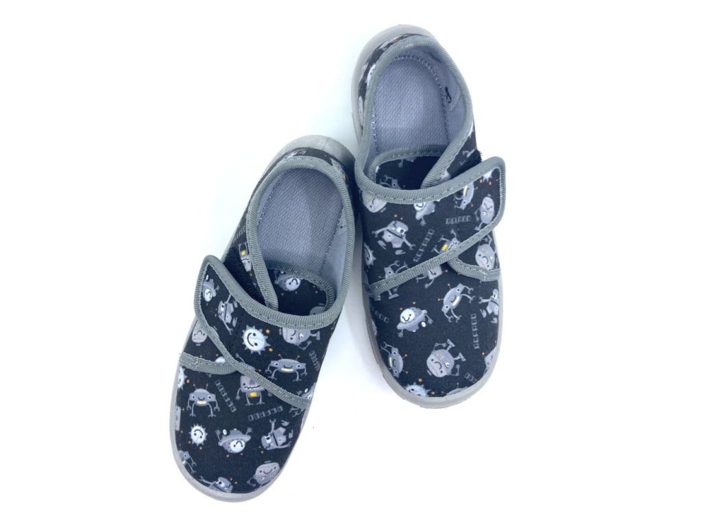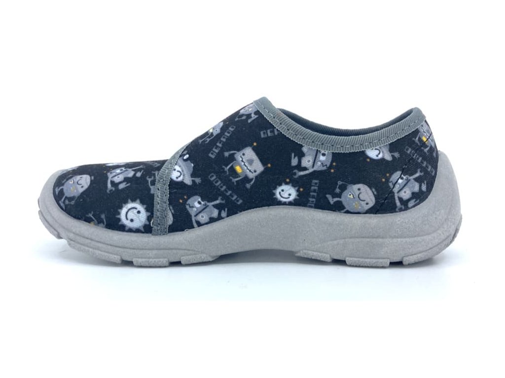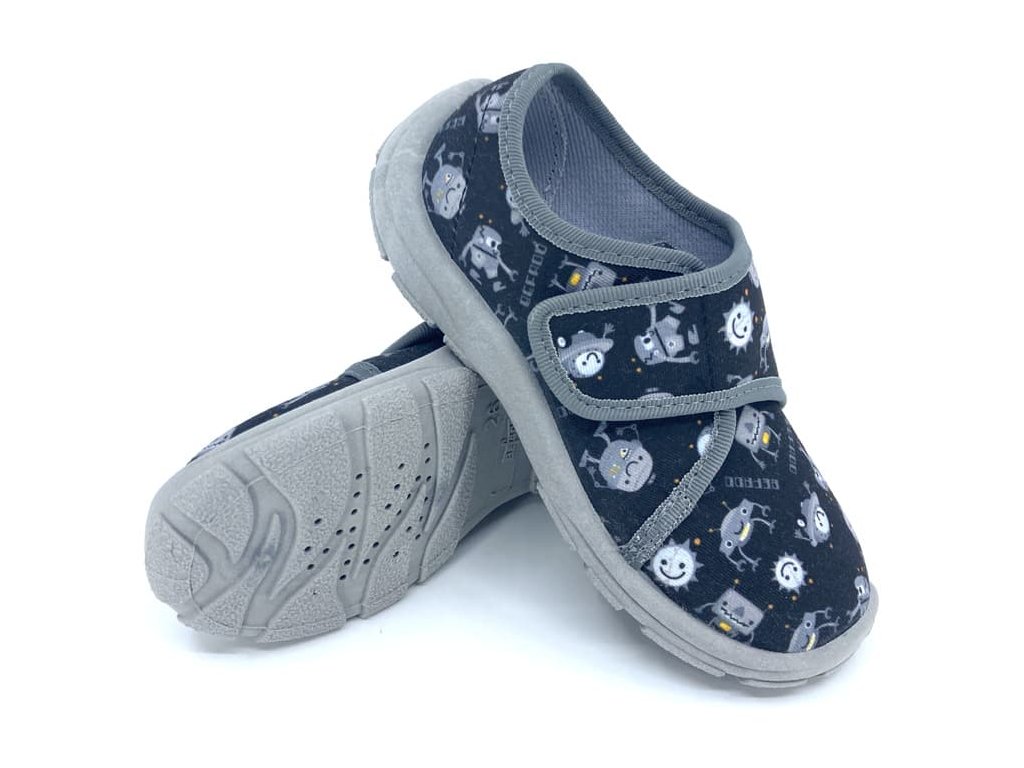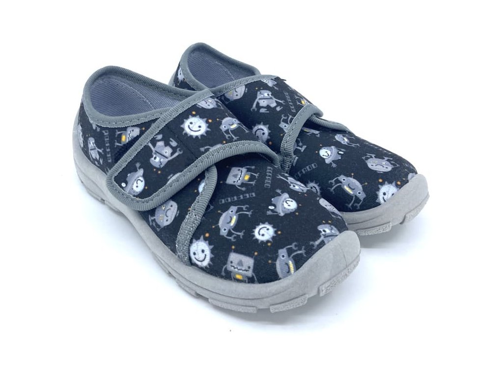 Stylové chlapecké bačkory Befado 974x577 v černé barvě s mimozemšťany a roboty jsou skvělé do školy, školky i na doma. Jsou velmi ohebné, mají zpevněný opatek a nevyjímatelnou vnitřní stélku. Podrážka je ve světle šedé barvě s hrubším vzorem a ventilačními otvory pro lepší prodyšnost.