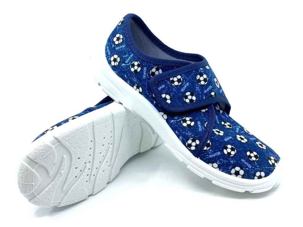 Stylové chlapecké bačkory Befado 974y509 v modré barvě s fotbalovým motivem. Bačkory jsou velmi ohebné, mají zpevněný opatek a nevyjímatelnou vnitřní stélku. Podrážka je v bílé barvě s hrubším vzorem a ventilačními otvory pro lepší prodyšnost. Bačkory nezanechávají šmouhy na podlaze, jsou tedy vhodné do školy i školky. V přední i zadní části je podrážka vyvýšená a chrání tak proti okopu. Svojí šířkou jsou vhodné na užší a normálně širokou nohu. Díky suchému zipu se dají přizpůsobit v oblasti nártu.