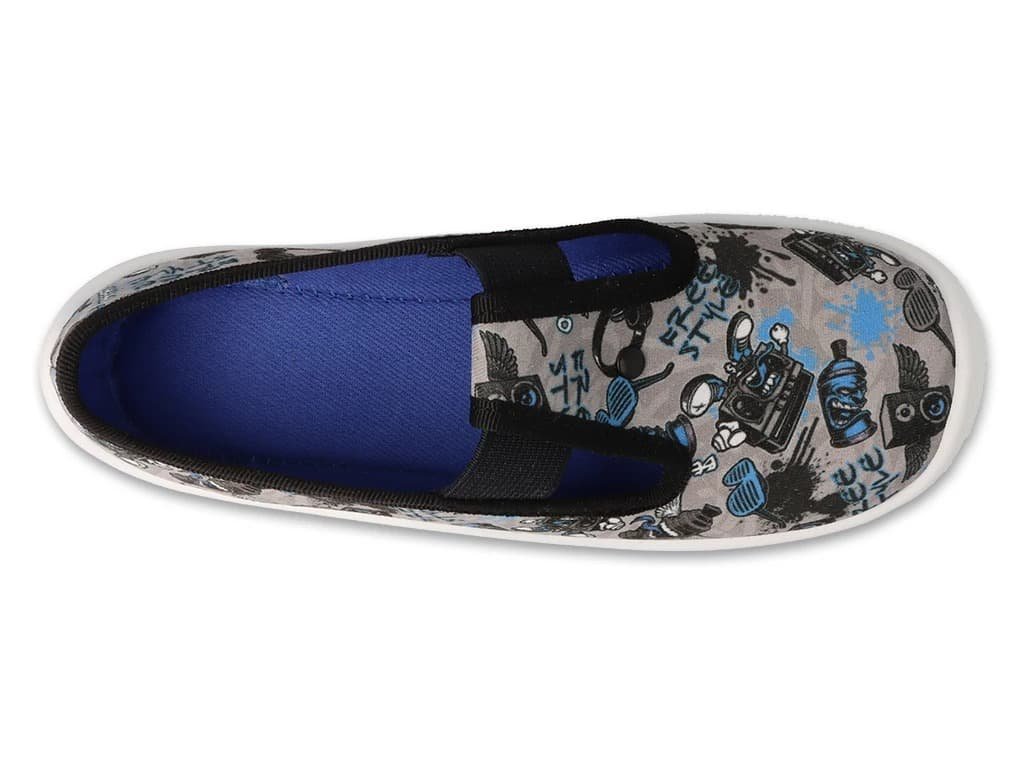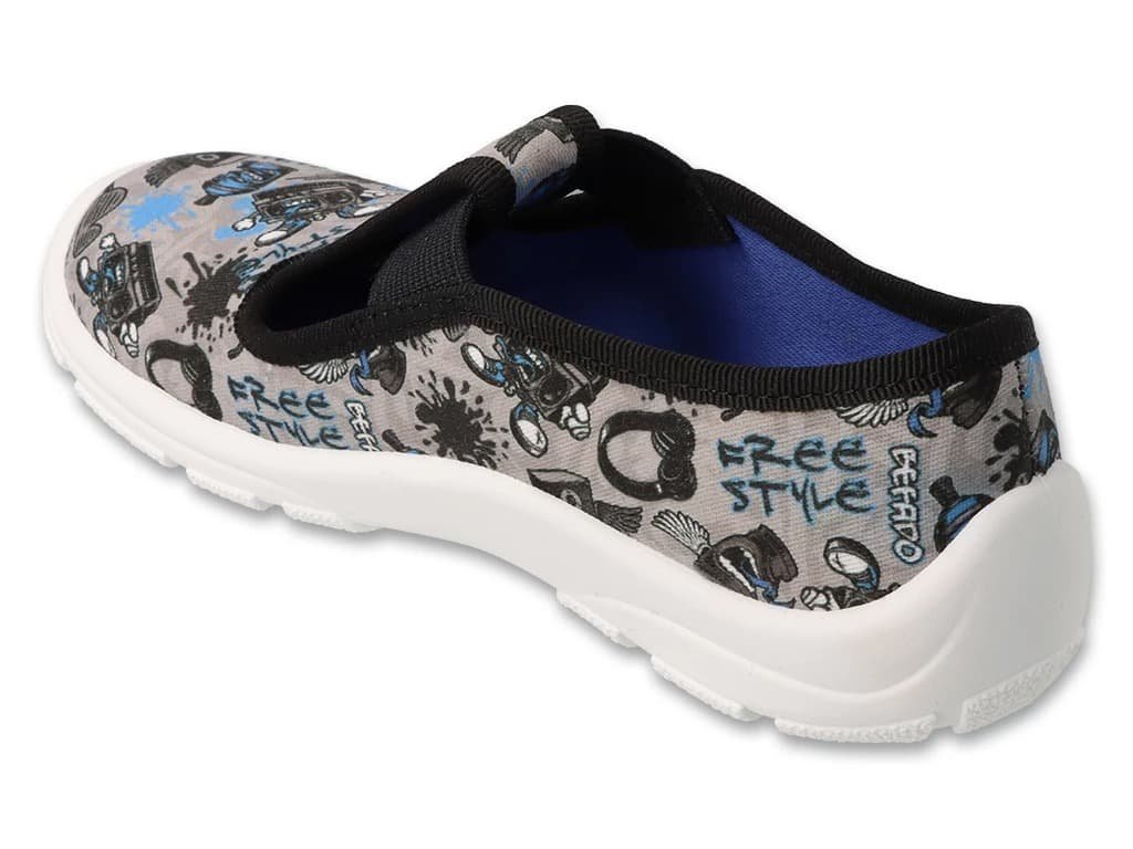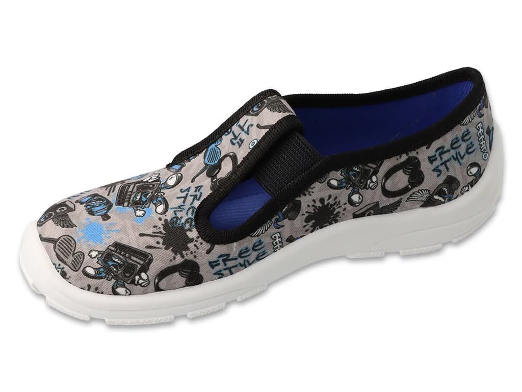 Stylové chlapecké bačkory 975y197 Modro-šedé. Bačkory jsou velmi ohebné všemi směry, mají zpevněný opatek a nevyjímatelnou vnitřní stélku. Podrážka je v praktické bílé barvě s hrubším vzorem a ventilačními otvory pro lepší prodyšnost. Bačkory nezanechávají šmouhy na podlaze, jsou tedy vhodné do školy i školky. V přední i zadní části je podrážka vyvýšená a chrání tak proti okopu. Svojí šířkou jsou vhodné na úžší až normální nohu. Přes nárt na gumičku.