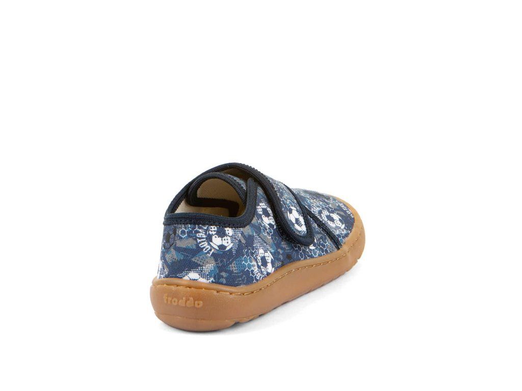 Bačkory Froddo Slippers G1700438-6 Blue s fotbalovým motivem jsou barefoot bačkory vhodné na doma nebo do školy či školky, ale použitelné i na běhání venku při teplém počasí. Sednou dětem s úzkou nohou a normálním až lehce vyšším nártem. Podrážka je ohebná všemi směry, gumová.
