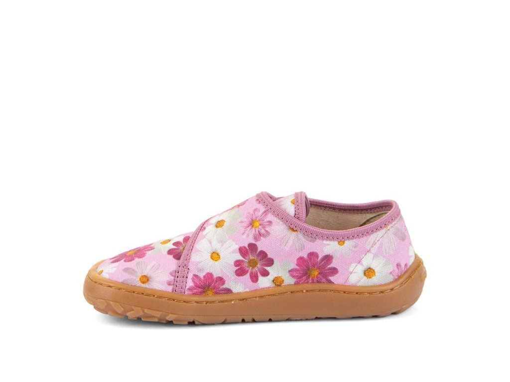 Bačkory Froddo Slippers G1700438-8 Flowers s kytičkami jsou barefoot bačkory vhodné na doma nebo do školy či školky, ale použitelné i na běhání venku při teplém počasí. Sednou dětem s úzkou nohou a normálním až lehce vyšším nártem. Podrážka je ohebná všemi směry, gumová.
