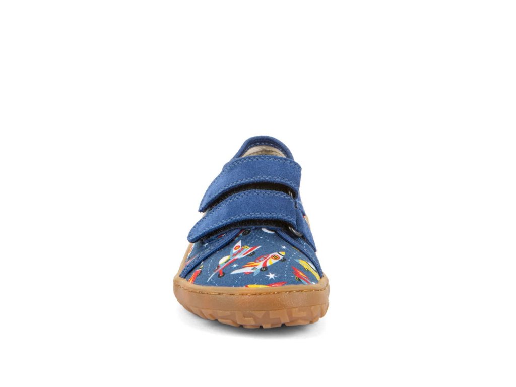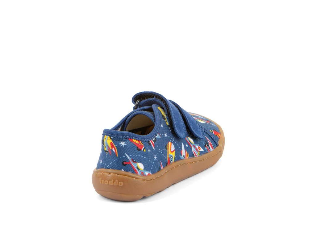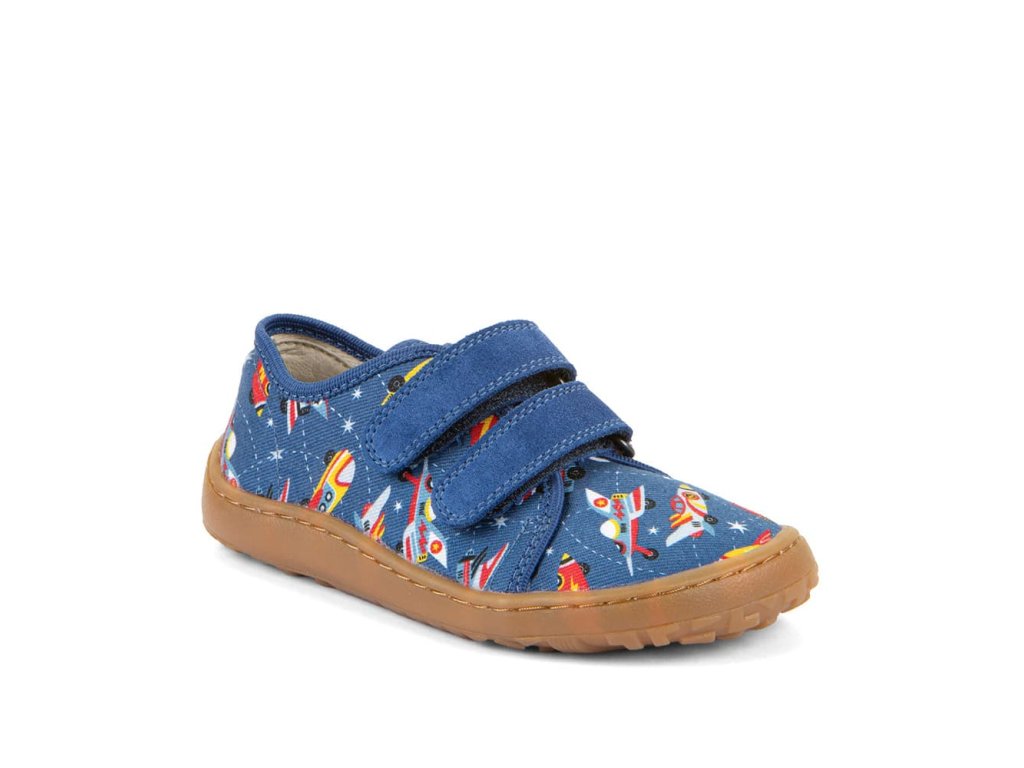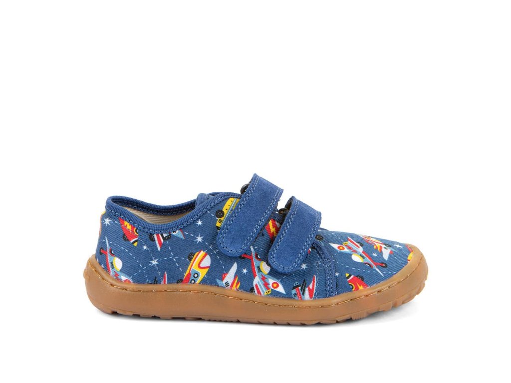 Barefoot textilní tenisky Barefoot Froddo Blue Eletrics G1700440-5 - letadla. Textilní vrchní část se dvěma suchými zipy z kůže a podrážka z gumy. Upravený model s novou ekologičtější vnitřní stélkou z mikrovlákna. Dají se použít jako tenisky pro teplejší dny, bačkory a nebo boty do tělocviku.