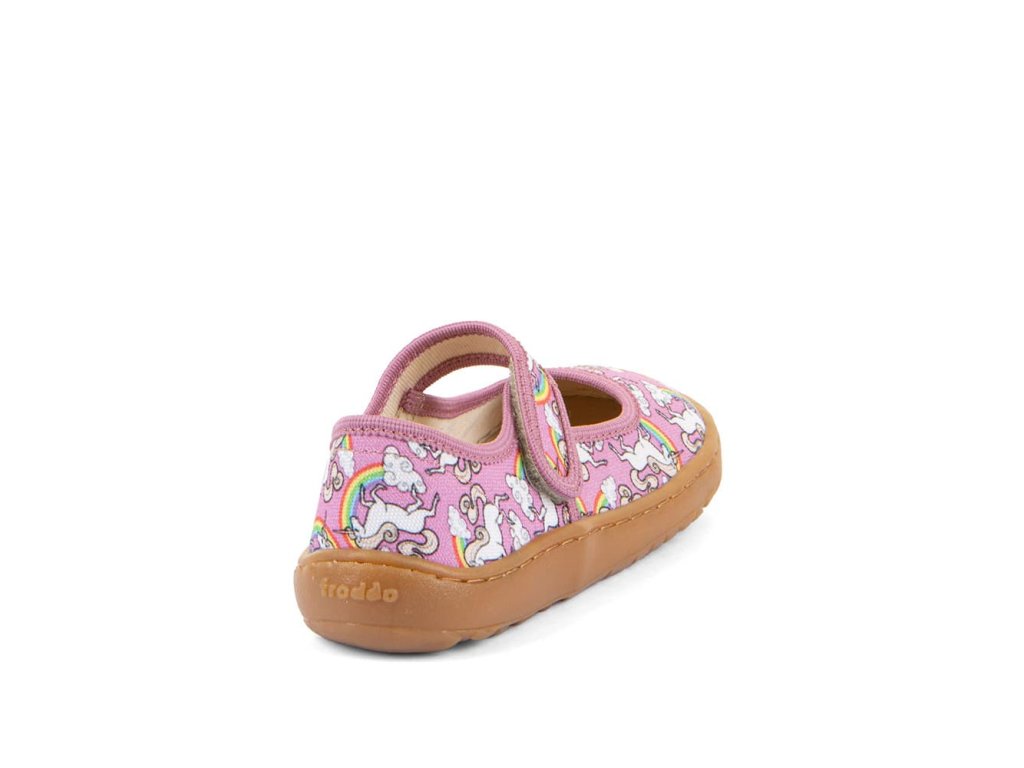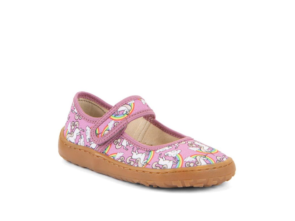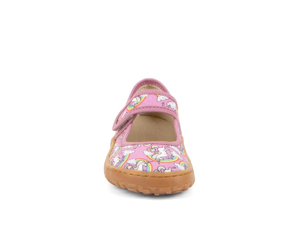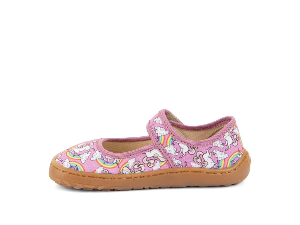 Barefoot Froddo - Canvas Balletty - White/Pink - G1700437-3 s jednorožcem jsou barefoot bačkory / balerínky vhodné na doma nebo do školy či školky, ale použitelné i na běhání venku při teplém počasí. Sednou dětem s úzkou nohou a normálním a nižším nártem. Podrážka je ohebná všemi směry, gumová.
