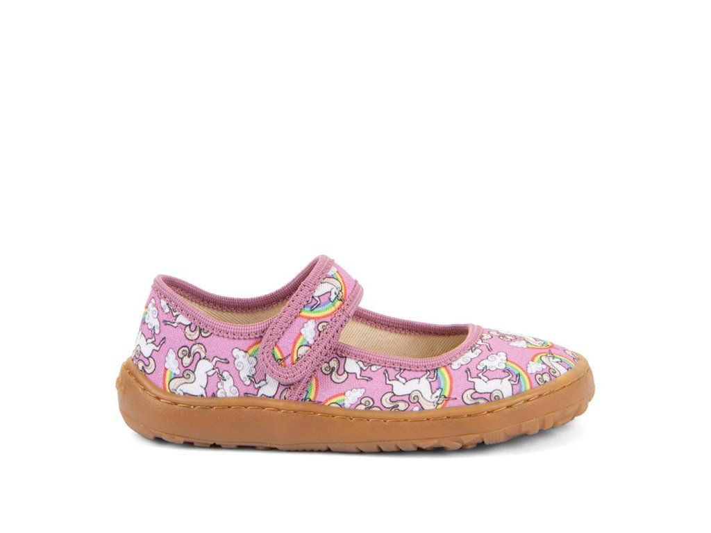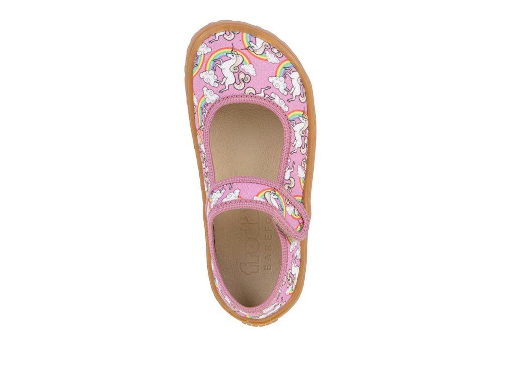 Barefoot Froddo - Canvas Balletty - White/Pink - G1700437-3 s jednorožcem jsou barefoot bačkory / balerínky vhodné na doma nebo do školy či školky, ale použitelné i na běhání venku při teplém počasí. Sednou dětem s úzkou nohou a normálním a nižším nártem. Podrážka je ohebná všemi směry, gumová.