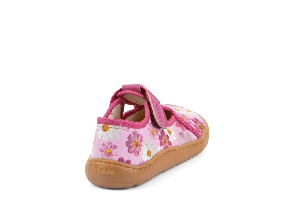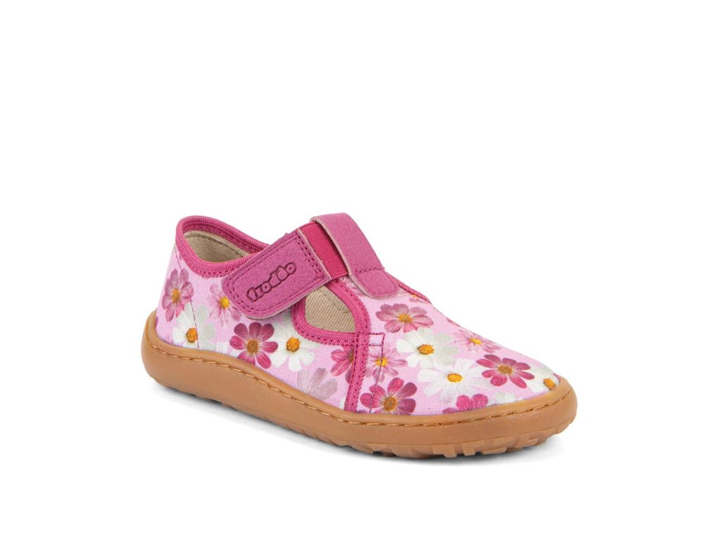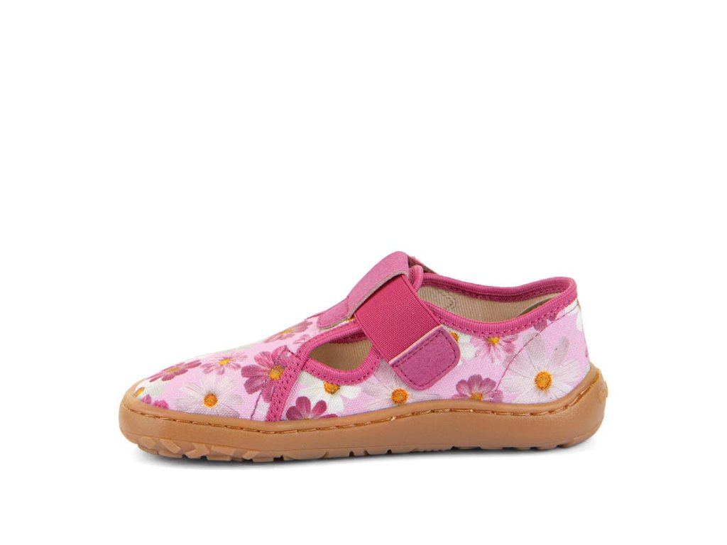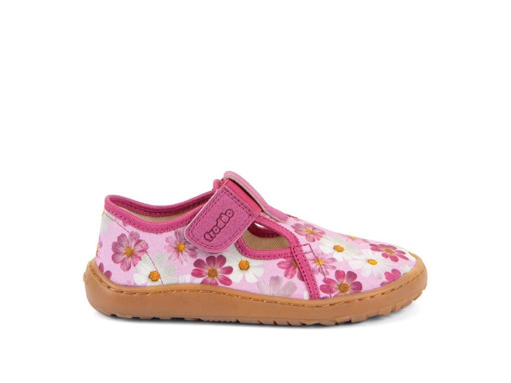 Barefoot Froddo Canvas T-bar G1700439-4 Flowers jsou barefoot bačkory vhodné na doma nebo do školy či školky, ale použitelné i na běhání venku při teplém počasí. Sednou dětem s úzkou nohou a normálním a nižším nártem. Podrážka je ohebná všemi směry, gumová.