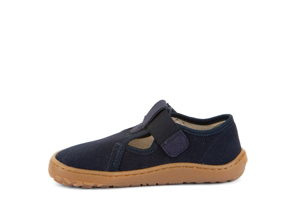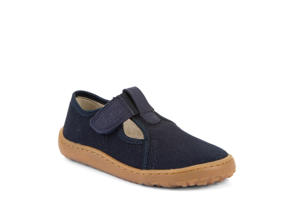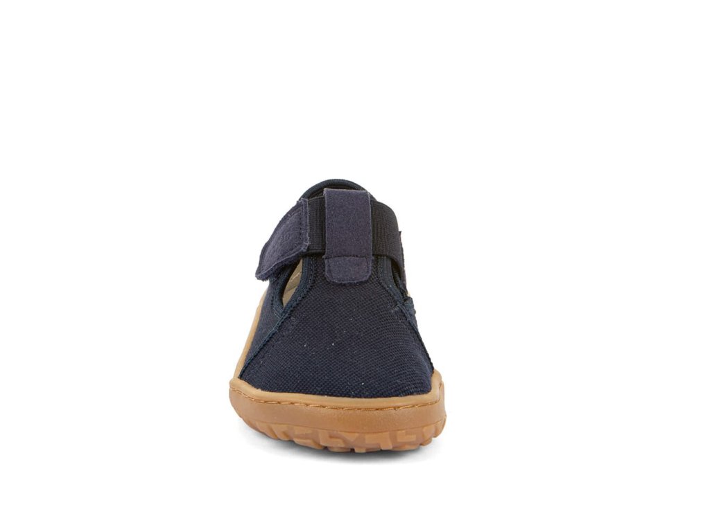 Barefoot Froddo Canvas T-bar G1700439 Dark Blue jsou barefoot bačkory vhodné na doma nebo do školy či školky, ale použitelné i na běhání venku při teplém počasí. Sednou dětem s úzkou nohou a normálním a nižším nártem. Podrážka je ohebná všemi směry, gumová.