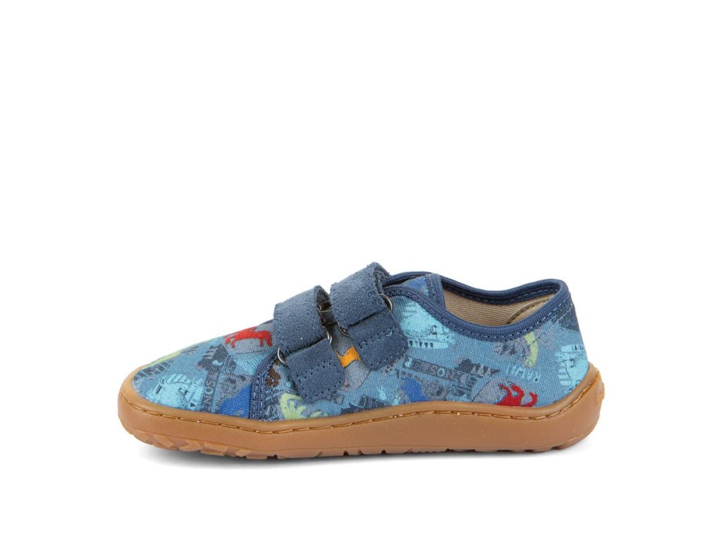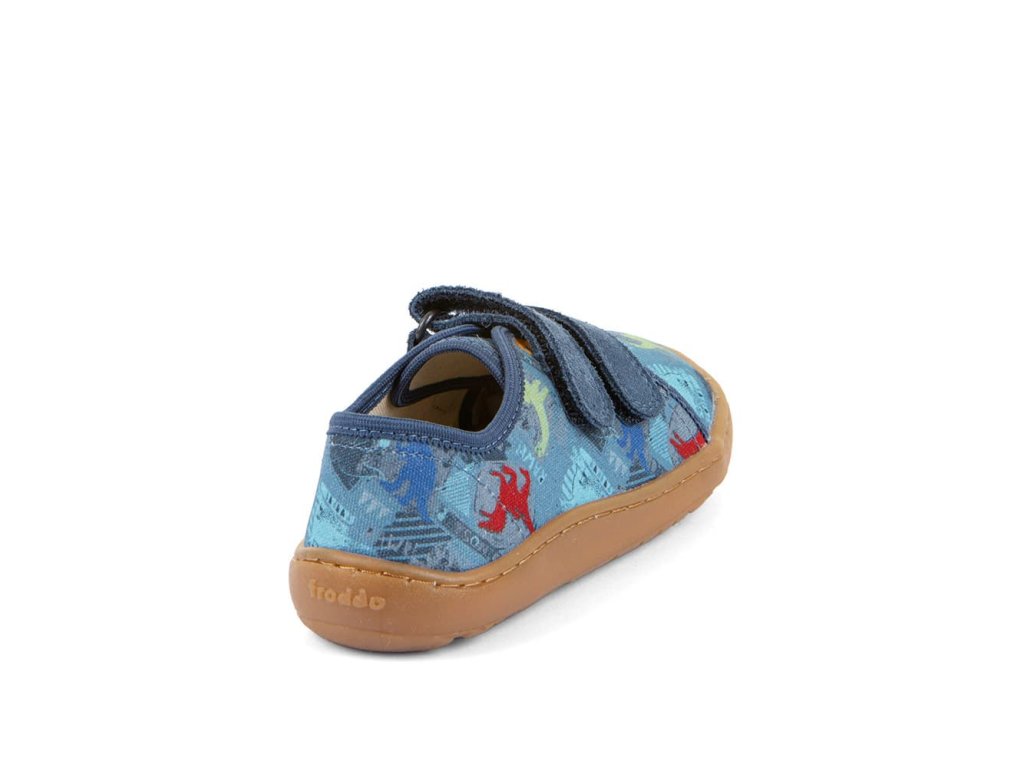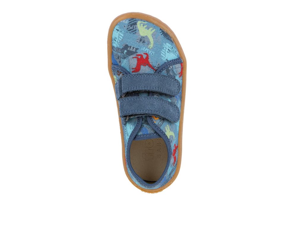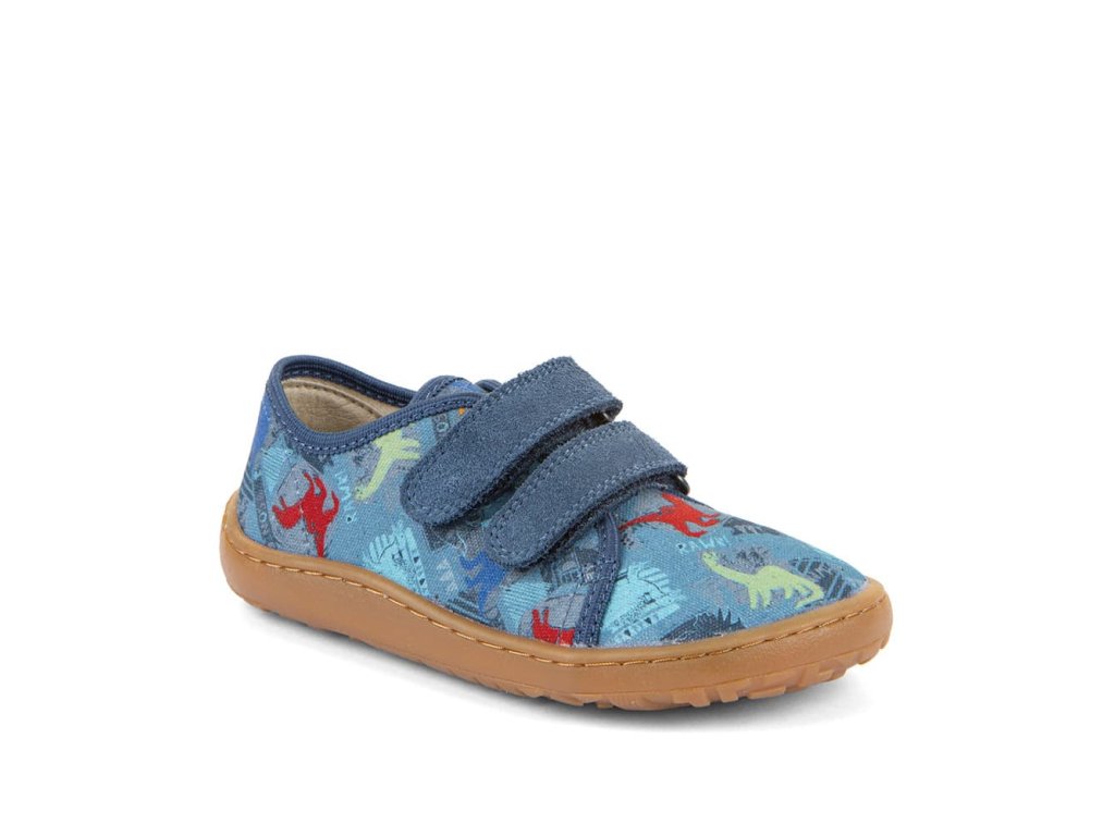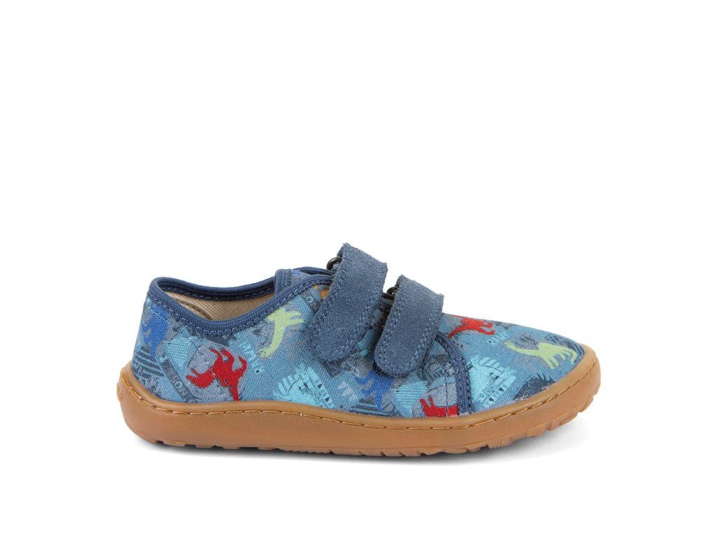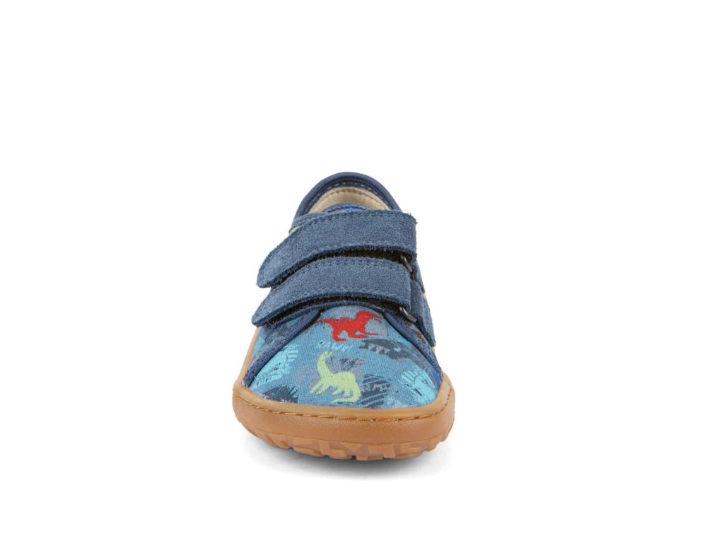 Barefoot textilní tenisky Barefoot Froddo Dark Denim G1700440-15 s motivem dinosaurů. Textilní vrchní část se dvěma suchými zipy z kůže a podrážka z gumy. Upravený model s novou ekologičtější vnitřní stélkou z mikrovlákna. Dají se použít jako tenisky pro teplejší dny, bačkory a nebo boty do tělocviku.