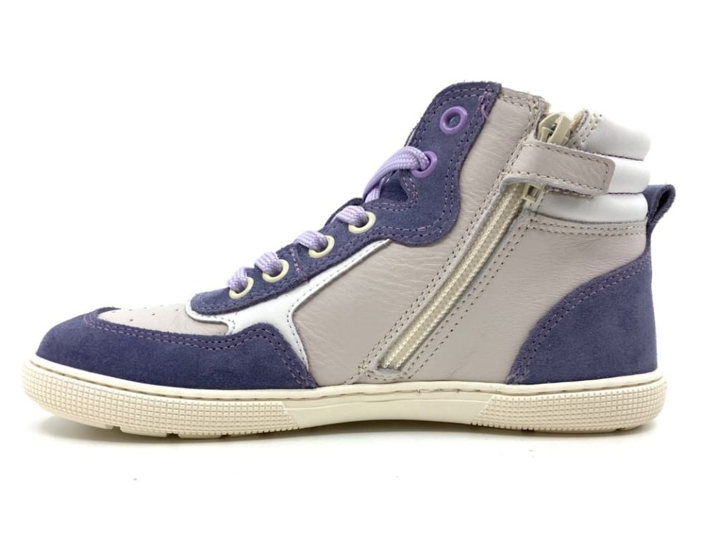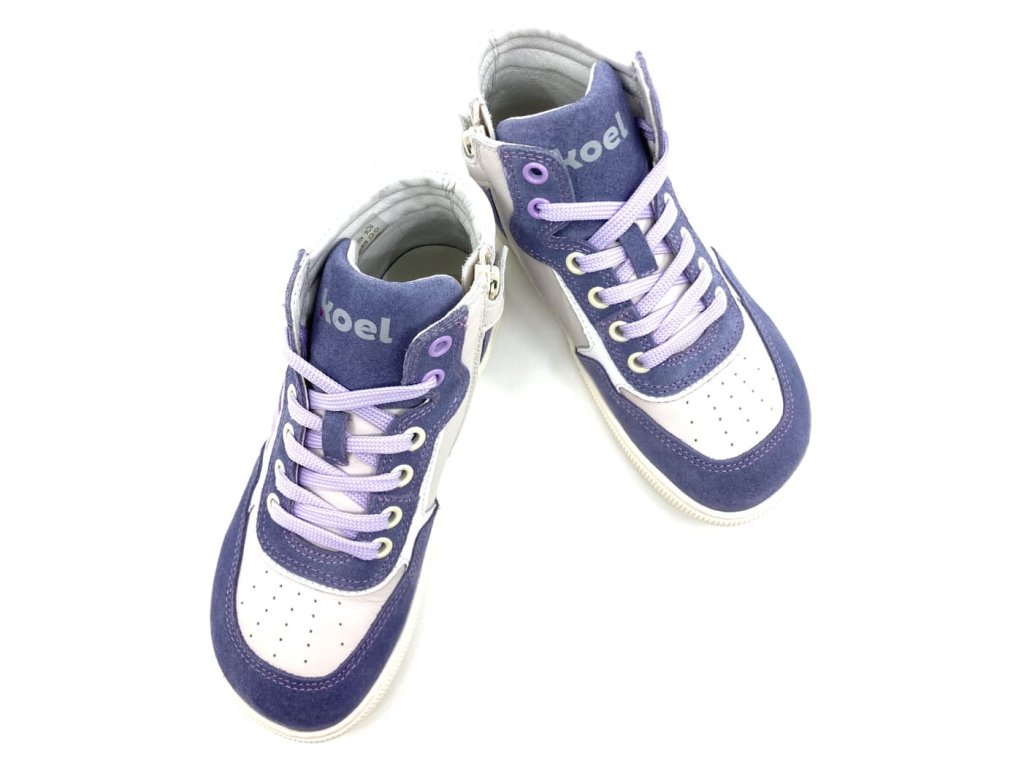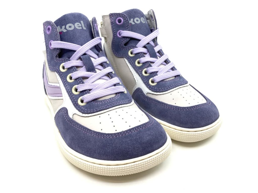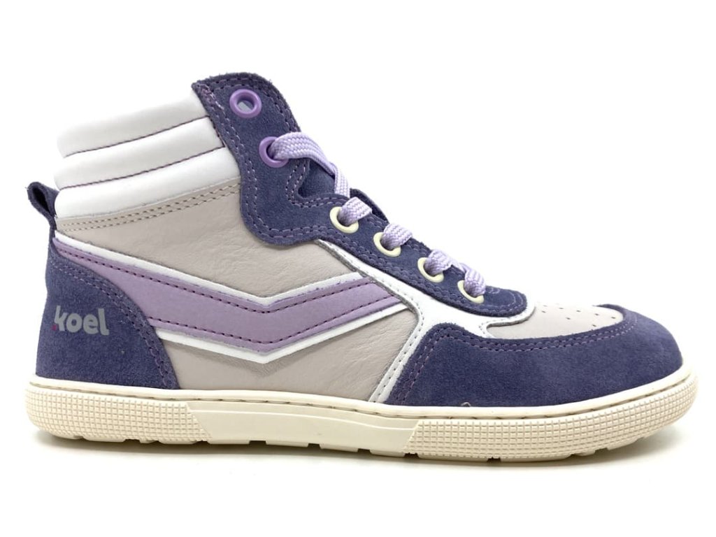 Barefoot kotníkové boty Koel - Danish Levandel - ve fialové barvě v kombinaci s šedobílou. Tyto moderní barefoot tenisky jsou ideální volbou pro děti a teenagery hledající pohodlnou a zdravou obuv pro každodenní nošení. Zaujmou svým designem a kvalitním zpracováním. Tenisky jsou perfektní pro jarní i podzimní dny. S podšívkou z bezchromové kůže jsou šetrné k citlivé dětské pokožce a zajišťují maximální pohodlí.