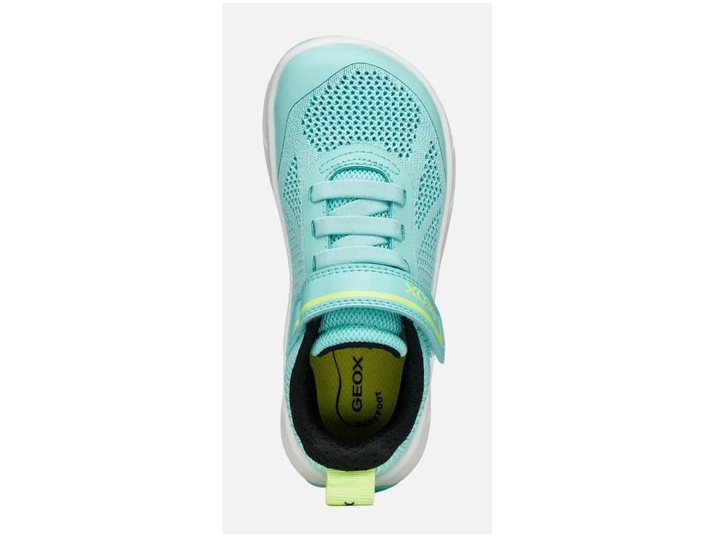 Barefoot tenisky Geox - J Foot-run Watersea/Acid Green - ve světle modré barvě jsou ideální volbou pro aktivní děti na hřiště i běhání po venku. Jsou lehké a perfektně prodyšné díky textilnímu svršku technologii Respira™, která zajišťuje ideální prodyšnost díky speciální membráně v podrážce. Ta odvádí vlhkost a zabraňuje pronikání vody dovnitř. Zcela nová gumová podrážka je velmi flexibilní a lehounká a přilne i na různorodém povrchu.