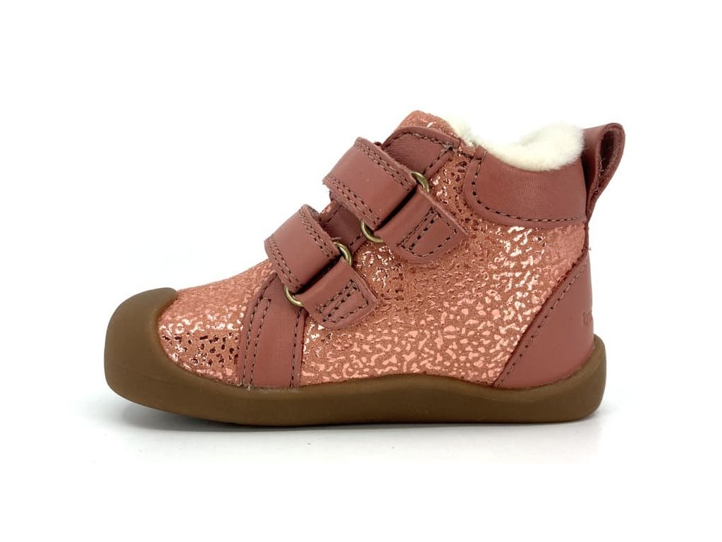 Dévčí zimní boty Bundgaard Bloom Tex Goldstream BG303317_9214 v třpytivé, růžové barvě jsou kožené zateplené zimní botičky s vlněným kožíškem a s membránou. Boty jsou střihem stejné jako oblíbený model Petit, jsou měkké, lehké a ohebné a vhodné i pro ty, kteří právě začínají chodit.