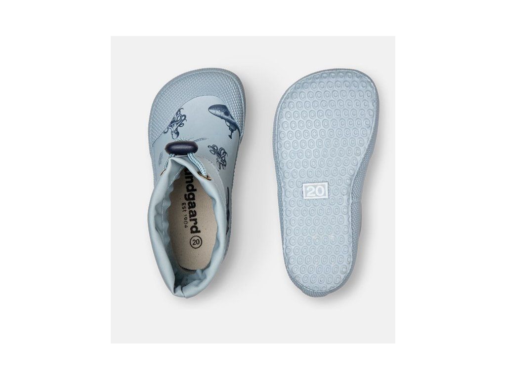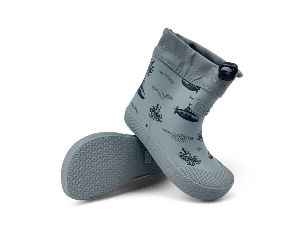 Dětské barefootové holínky Bundgaard CoverTeal v modré barvě s potiskem moře mají velice ohebnou podrážku a celé jsou měkkoučké, vyrobené speciálně pro malé děti. Díky praktickému stahování v oblasti lýtka do bot nenateče voda. Zesílená špička s dostatkem prostoru pro prsty, vhodné i pro dominantní palec. Boty jsou bez zateplení, mají textilní podšívku s vyjímatelnou vložkou a reflexní prvek v zadní části.