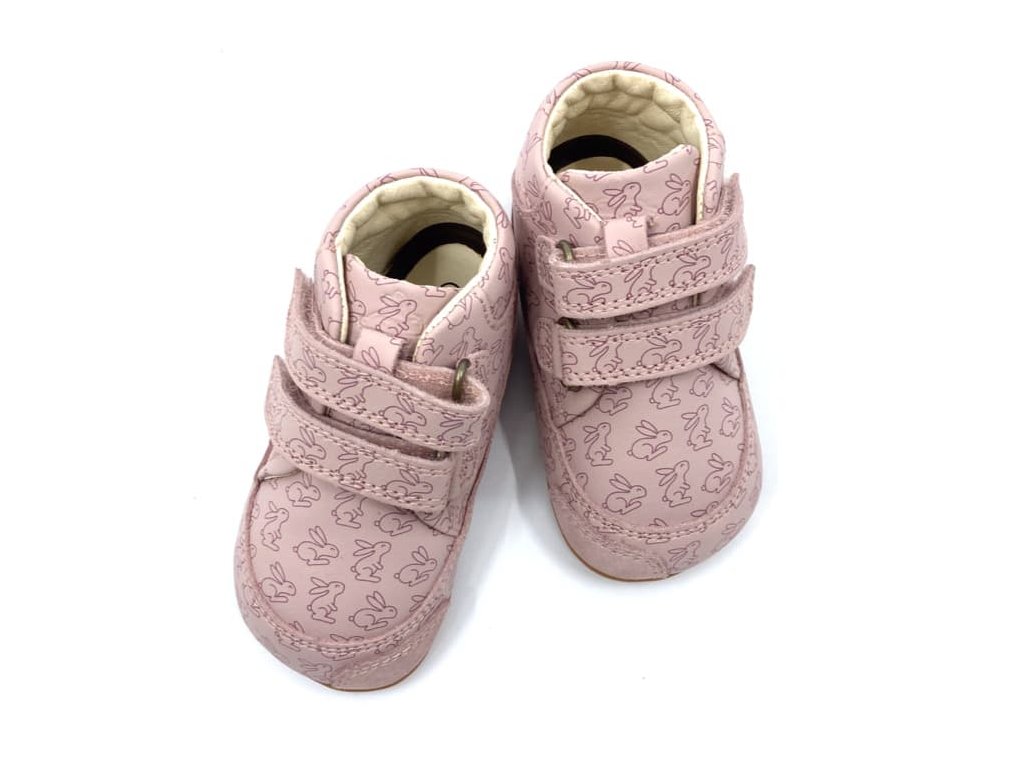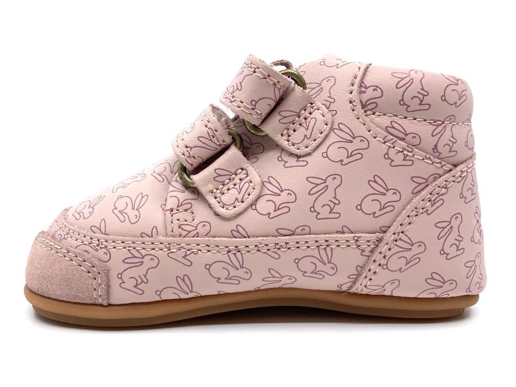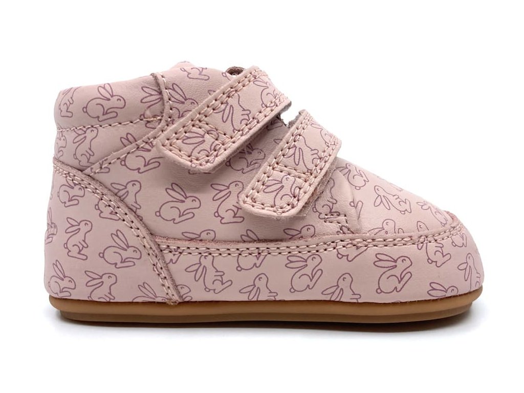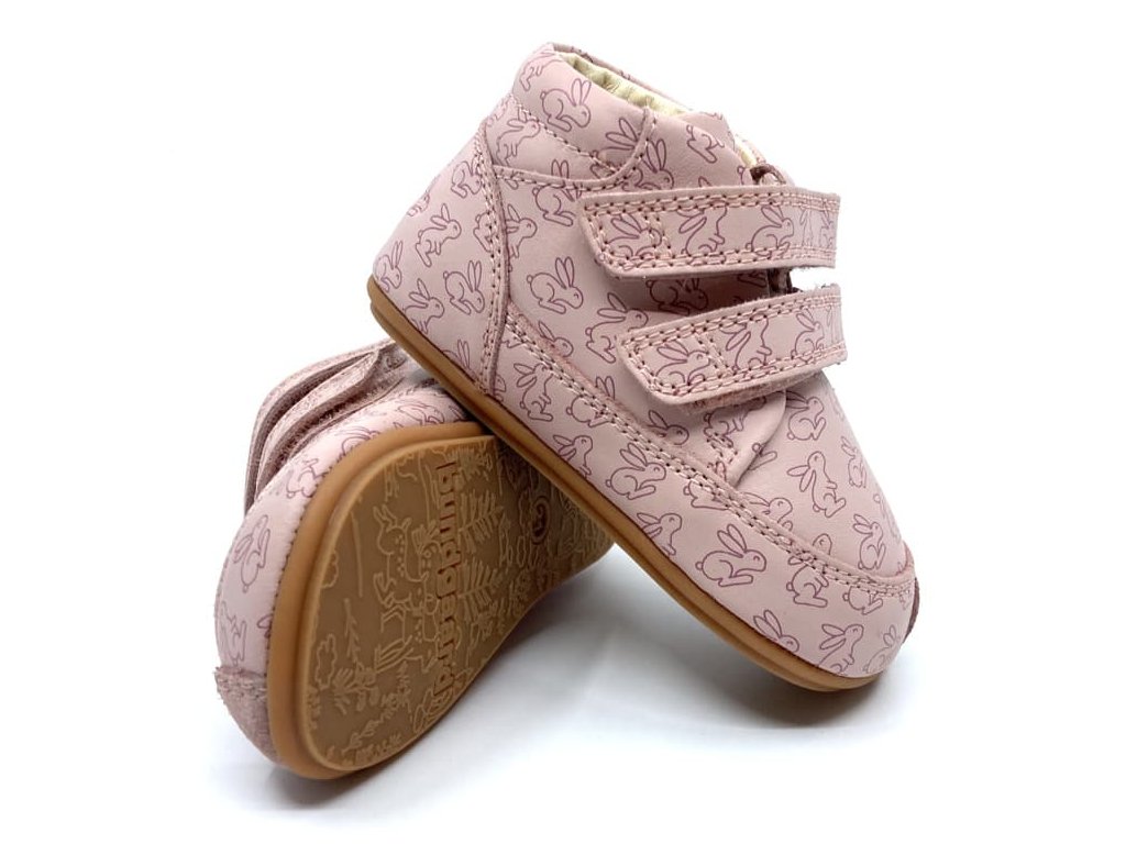 Kožené Barefoot boty Bungdaard Prewalker II Strap vhodné na první krůčky. Celoroční boty ve světle růžové barvě Old Rose s motivem králíčků jsou velmi měkké a ohebné všemi směry. Prostorná špička respektující volný pohyb prstů v botě jak do šířky, tak i výšky. Jsou tedy vhodné pro dominantní palec i vyšší nárt. Zesílená vrstva v opatkové i prstové části chrání proti okopu. Podrážka je velmi tenká, s jemným zvířátkovým vzorem. Podšívka je rovněž z příjemné kůže, vyjímatelnou koženou stélkou s mírným patním lůžkem.