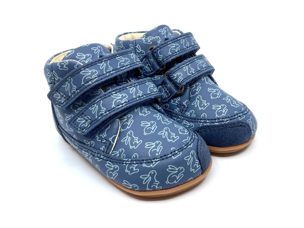 Kožené Barefoot boty Bungdaard Prewalker II Strap vhodné na první krůčky. Celoroční boty v modré barvě Teal s motivem králíčků jsou velmi měkké a ohebné všemi směry. Prostorná špička respektující volný pohyb prstů v botě jak do šířky, tak i výšky. Jsou tedy vhodné pro dominantní palec i vyšší nárt. Zesílená vrstva v opatkové i prstové části chrání proti okopu. Podrážka je velmi tenká, s jemným zvířátkovým vzorem. Podšívka je rovněž z příjemné kůže, vyjímatelnou koženou stélkou s mírným patním lůžkem.
