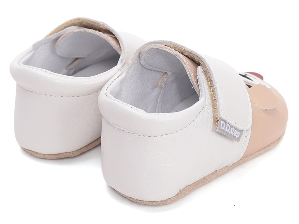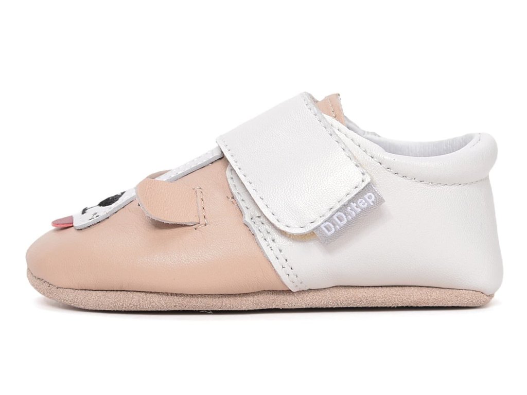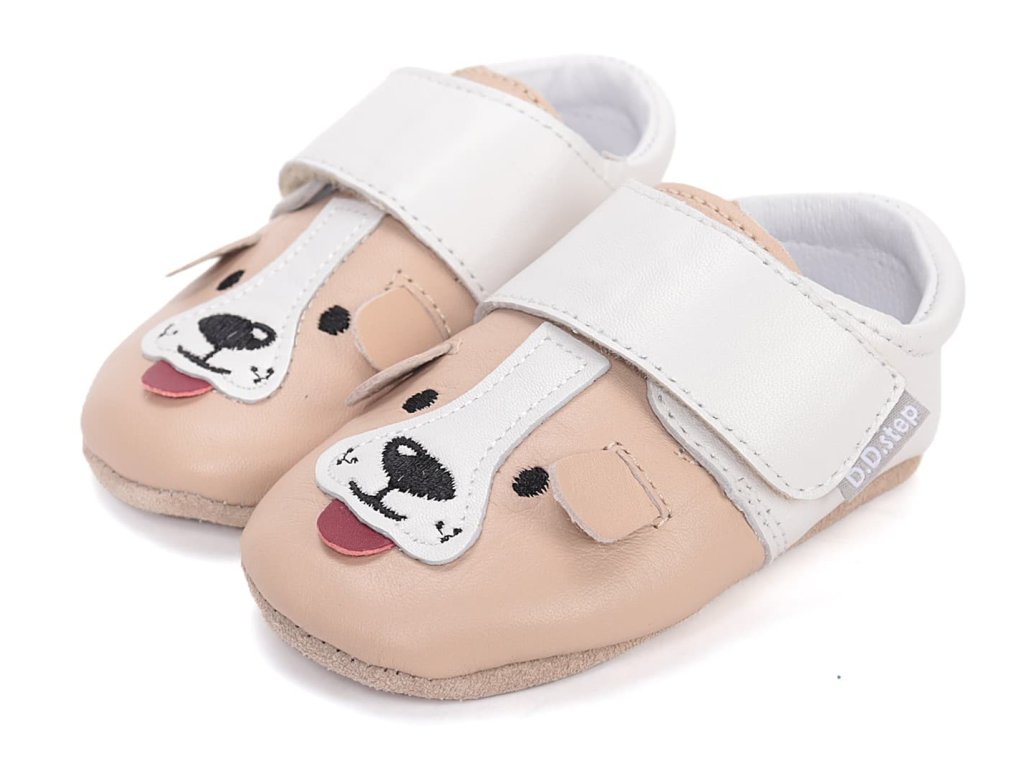 Kožené capáčky DD Step K1596-61565 Cream jsou ideální pro první krůčky, ať už kolem nábytku, tak i ty úplně samostatné bez opory. V béžové barvě s motivem pejska.