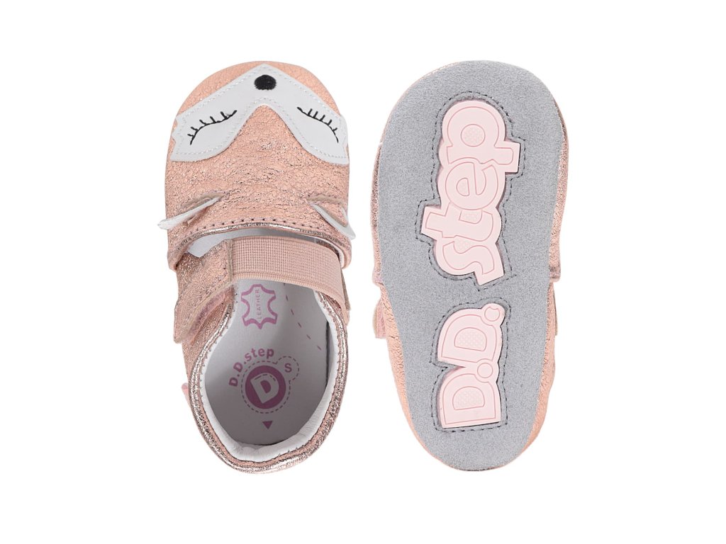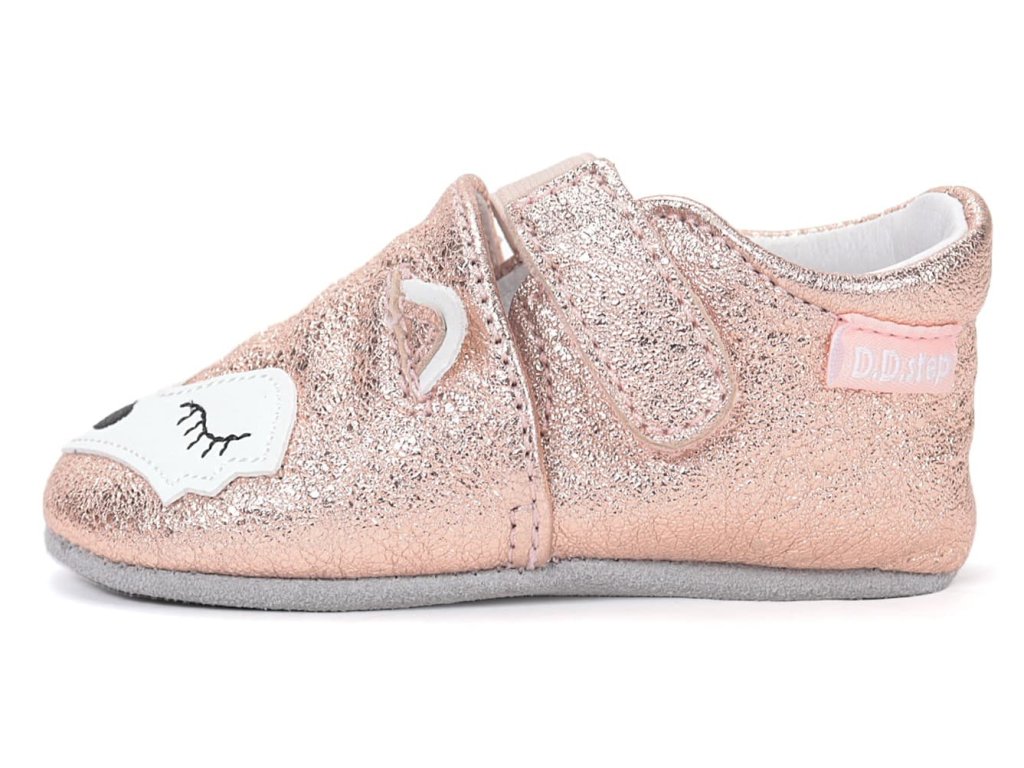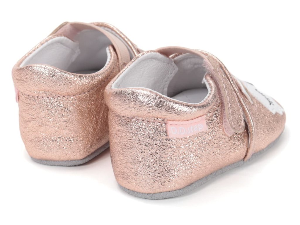 Kožené capáčky DD Step K1596-61688 Gold Rose jsou ideální pro první krůčky, ať už kolem nábytku, tak i ty úplně samostatné bez opory. V růžové třpytivé barvě s oblíbeným motivem lištičky.