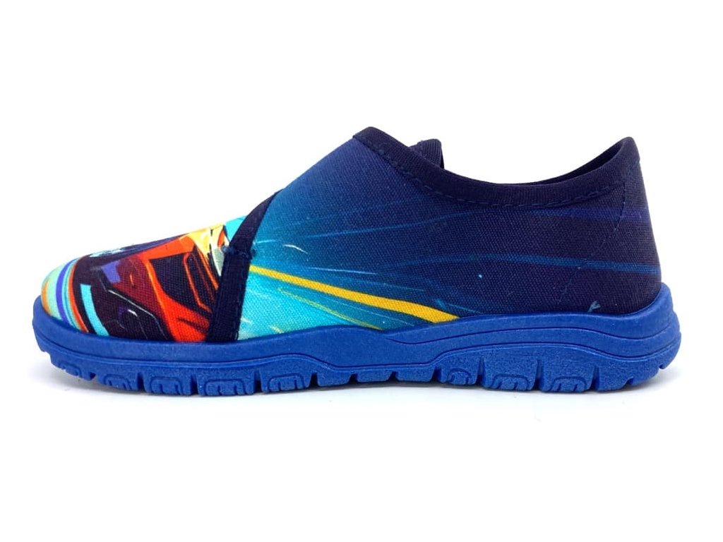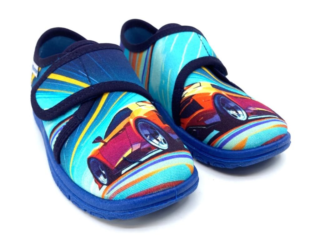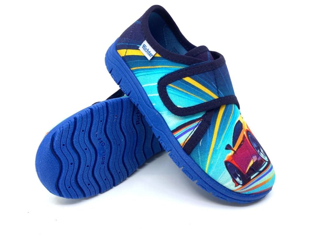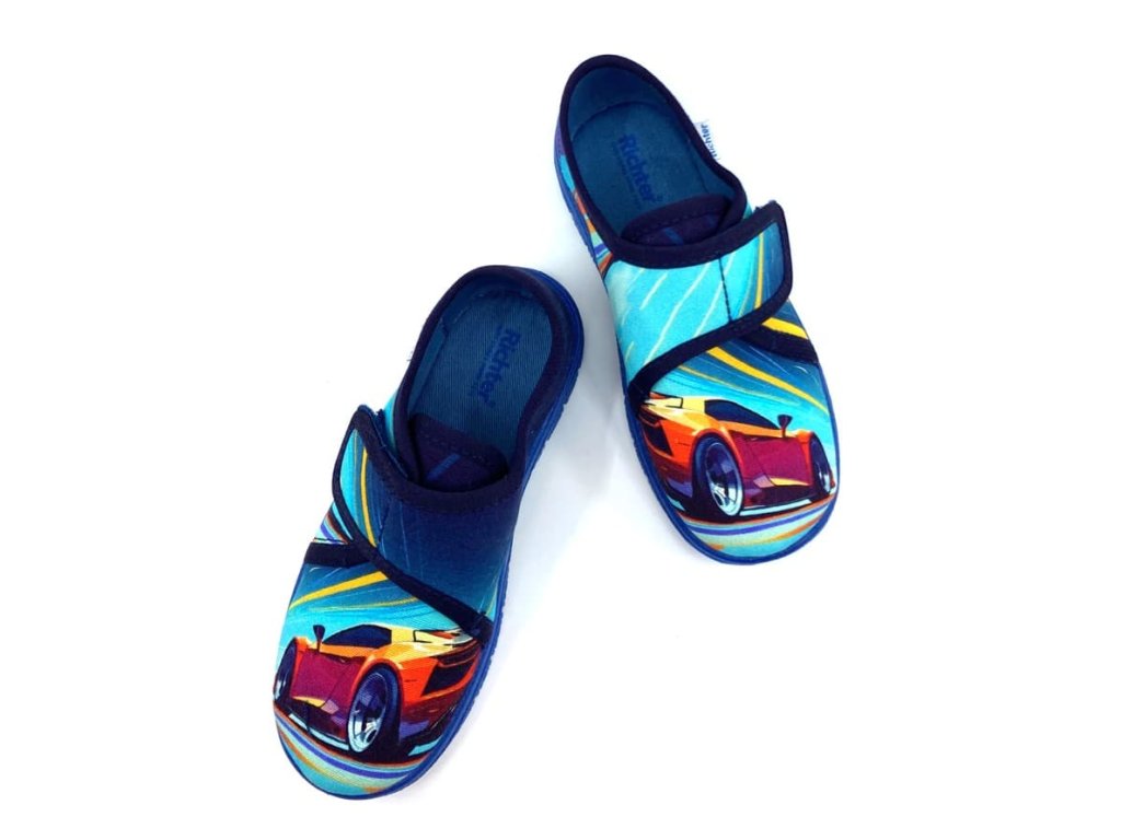 Chlapecké bačkory Richter 9000-3296 Baumwolle Dig. Roads2 v modré barvě s motivem auta jsou pohodlné papuče se zapínáním na suchý zip, ideální i pro vyšší nárt. Podrážka je měkká, ohebná, s větracími otvory pro lepší prodyšnost, a vyvýšenými částmi proti okopu. Tyto bačkory jsou skvělou volbou na doma do školky i do školy.
