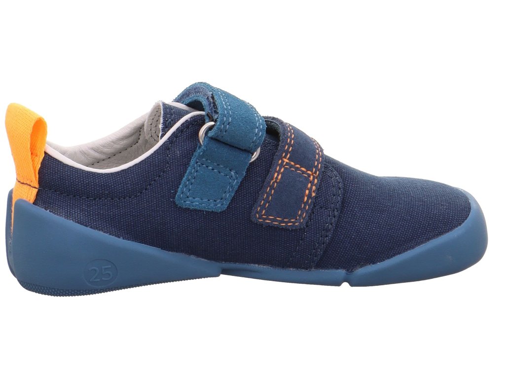 Chlapecké barefoot boty Superfit Vento 1-008201-8000 v tmavě modré barvě s oranžovými detaily. Nízké barefoot tenisky vynikají svou lehkou podešví, flexibilitou a kvalitním zpracováním. Boty jsou vhodné spíše na teplejší jaro a léto. Plátěnky se dají využít i jako bačkory a to díky své prodyšnosti a nonmarking podrážce.