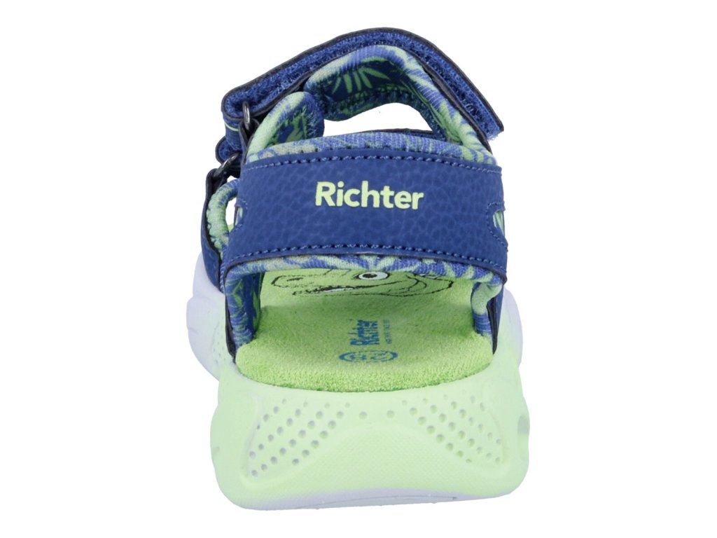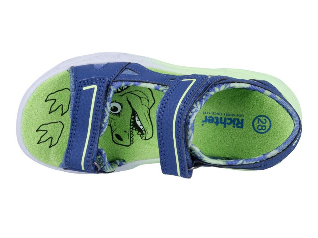 Chlapecké svítící sandálky Richter 4101 3272 6811 Tora/Kiwi v modro zelené barvě s motivem dinosaura. Botičky navíc blikají při došlapu vaše ratolesti si je zamilují na první pohled . Otevřená špička je skvělá do teplých letních dnů, příjemná textilní podšívka i stélka zvyšují pohodlí. Sandály se dají skvěle přizpůsobit pomocí suchých zipů na nártu i okolo kotníku.
