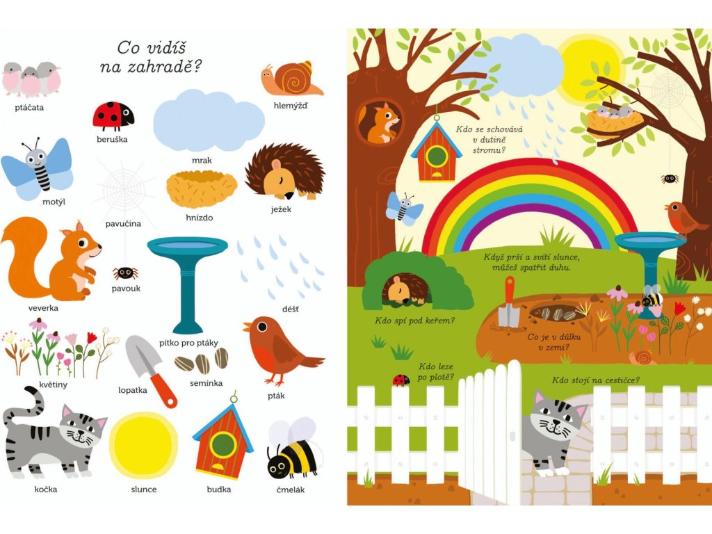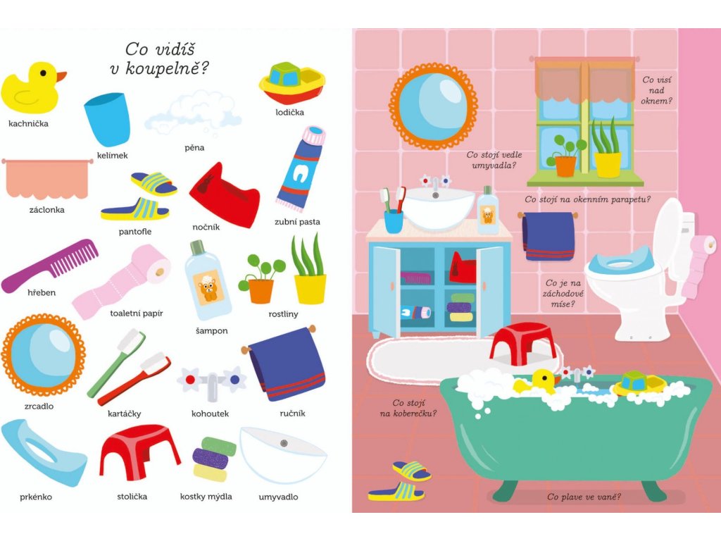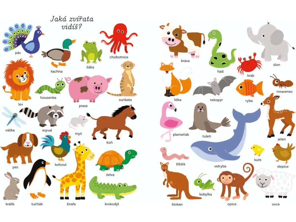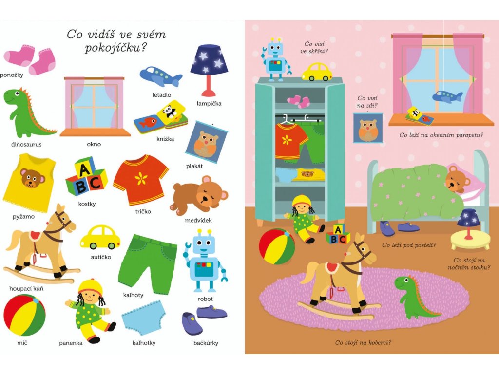 Co dítě kolem dvou let vidí, co vnímá? A jak tomu říká? Správnému rozvoji a osvojování základní slovní zásoby můžete napomoci s touto velkou knihou plnou slovíček a ilustrací předmětů z bezprostředního okolí dítěte. Co vidíš v pokoji, v kuchyni, v koupelně? A co na zahradě? Další témata jsou u dětí rovněž velmi oblíbená – zvířata a dopravní prostředky. Učení slov je s touto knížkou pro nejmenší zábava.