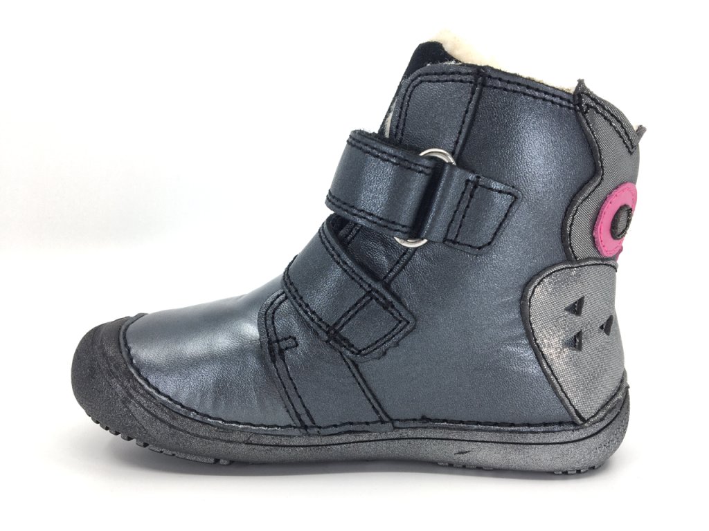 Dívčí zimní boty barefoot DD step 063-822A. Převládající černá barva s černou podrážkou a všudypřítomným třpytivým efektem. V zadný části je třpytivá stříbrno-šedá sovička s růžovýma očima a nosem.