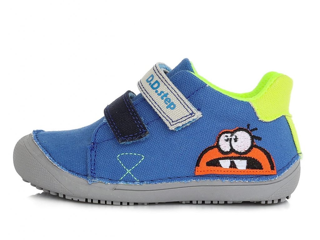 Textilní barefoot tenisky DDstep C063-313 Bermuda Blue v kombinaci modré barvy s fosforovými prvky a praktickou šedou podrážkou.