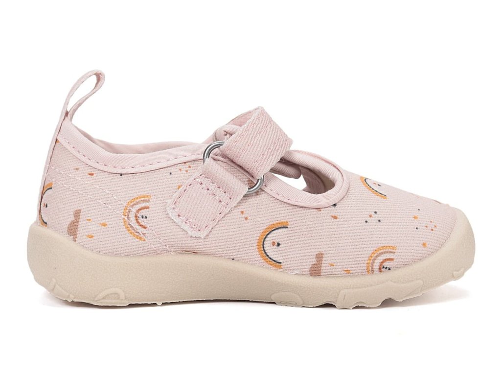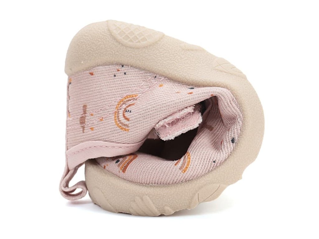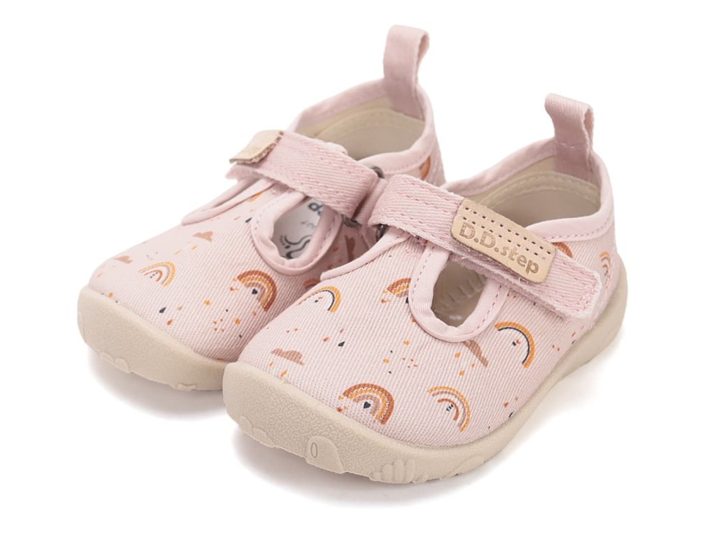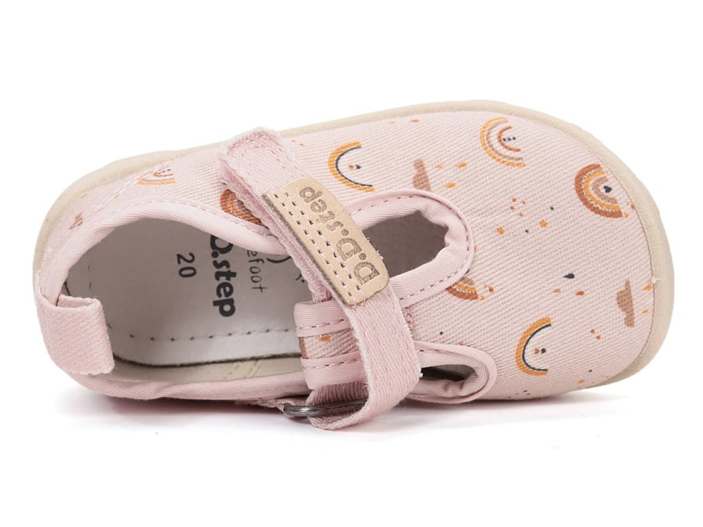 Dívčí barefoot bačkory/ plátěnky. DD Step C086-61991M Baby Pink v růžové barvě s duhovým motivem. Boty jsou perfektně prodyšné, měkké a ohebné. Vyjímatelná pěnová stélka je potažená mikrovláknem. Opatek je měkký a nikde netlačí. Podrážka je perforovaná pro lepší ventilaci.