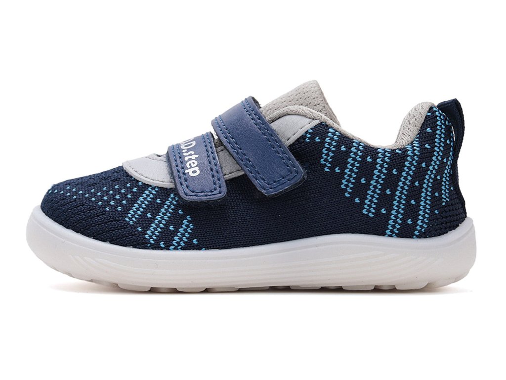Chlapecké barefoot textilní tenisky DD Step F093-51399 v modré barvě jsou díky textilnímu svršku i podšívce perfektně prodyšné a dítko je unosí na hřiště i na procházky během teplého jara i léta. Boty sednou spíše na širší nožky s dominantním palcem a díky velcro páskům se dají perfektně utáhnout na různé výšky nártu.