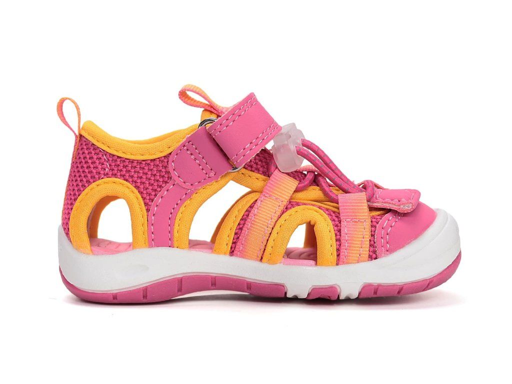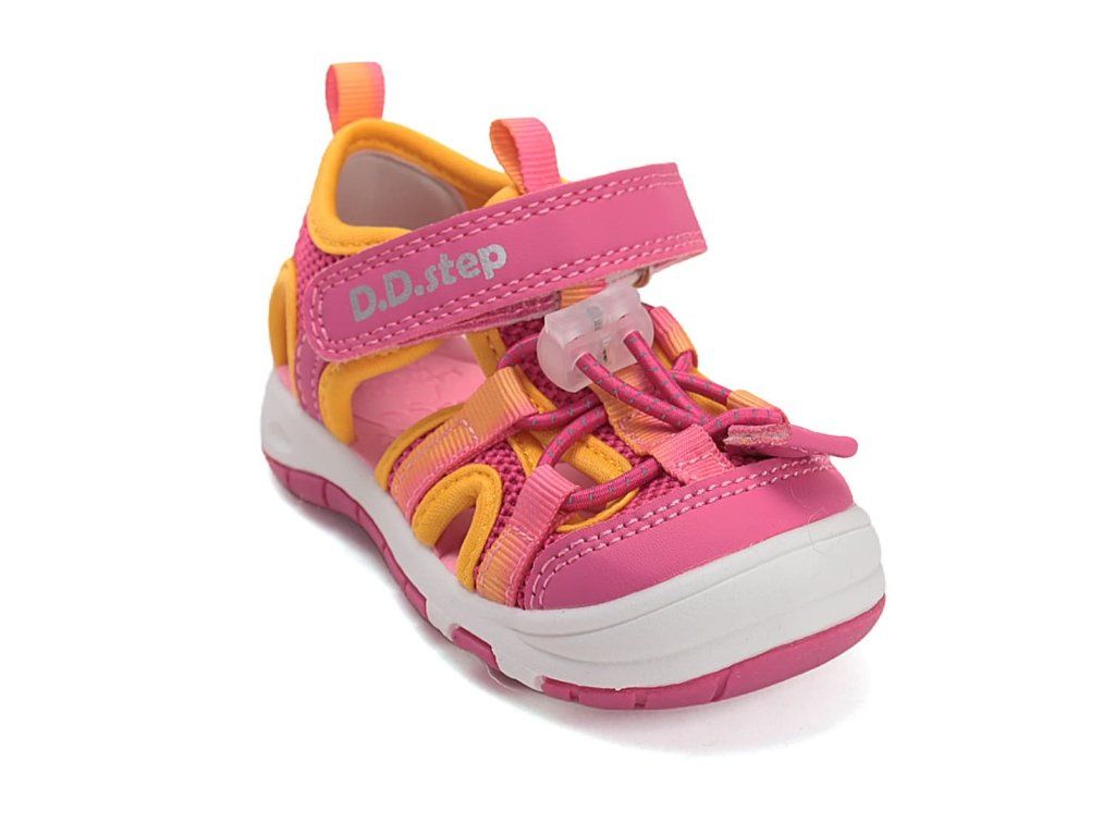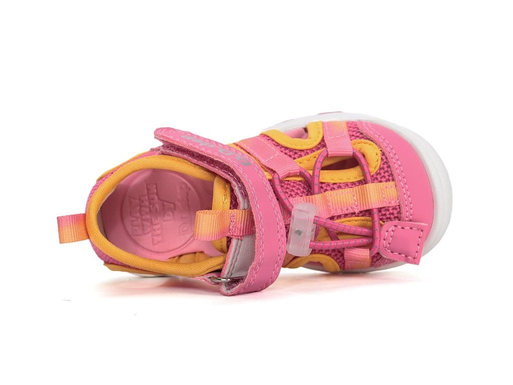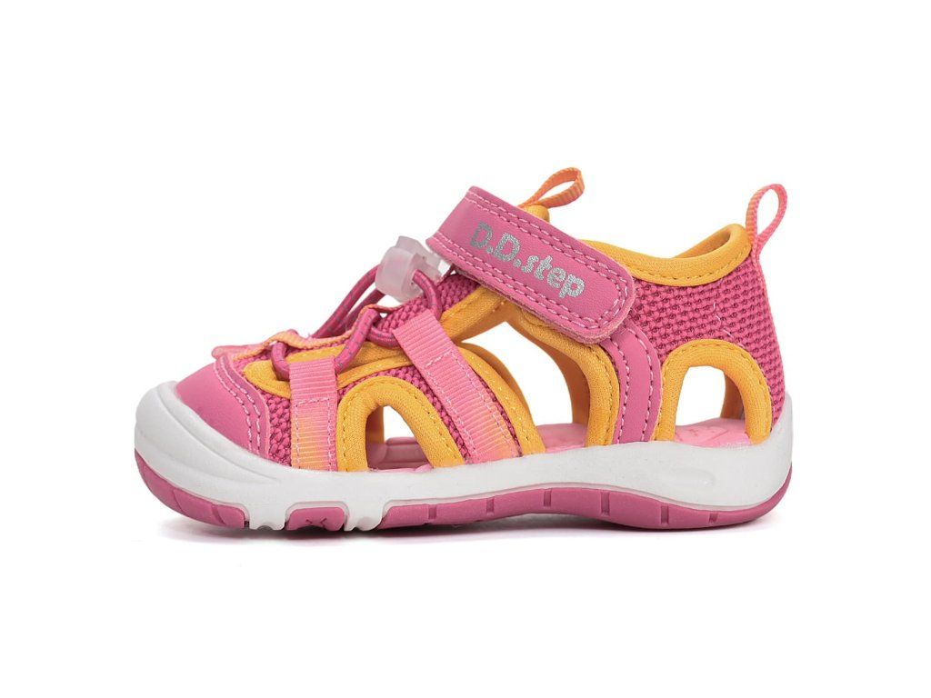 Dívčí sandálky DD Step G065-61599C v růžové barvě se žlutými detaily se brzy stanou oblíbeným kouskem vaši ratolesti. Svršek tvoří prodyšná syntetická textilie. Sandále jsou velmi ohebné a lehké, perfektní na každodenní nošení na hřiště i na procházky během parného léta.