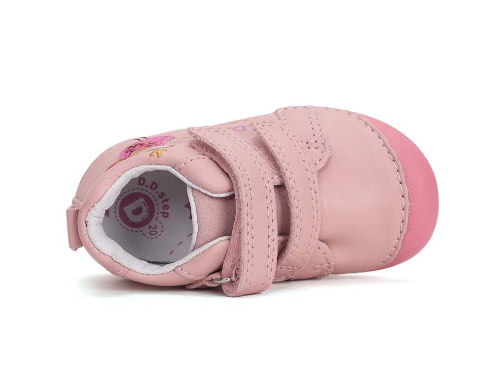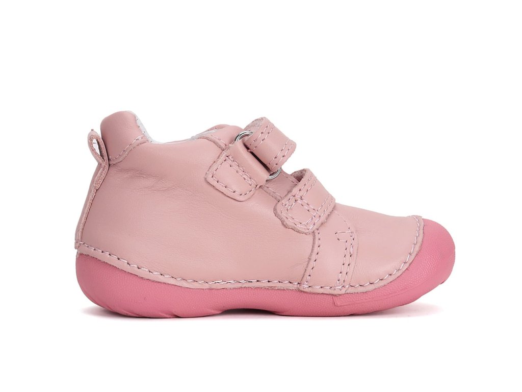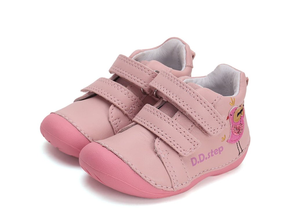 Konkrétně DDstep s015-51542 Baby Pink jsou z hladké kůže v jemné růžové barvě s motivem ptáčka.