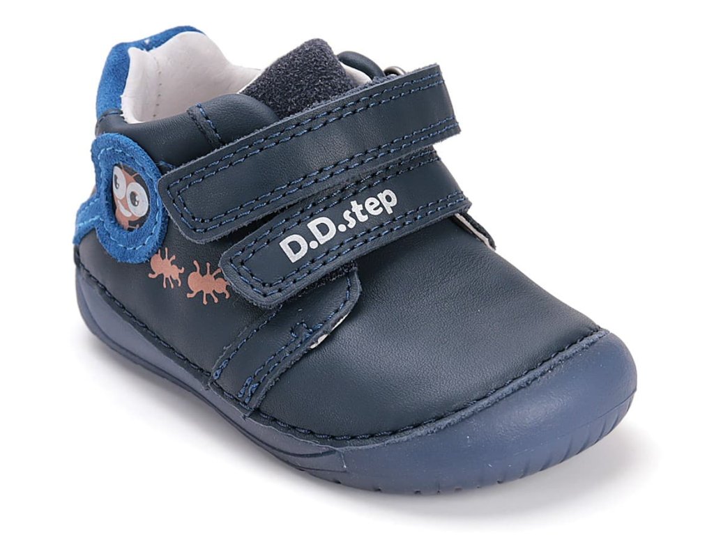 DD step s070-52576A Royal Blue - chlapecké barefoot boty vhodné na normální a širší nožky. Z praktické hladké kůže v modré barvě s motivem mravenečků na boku. Široká přední část a výborně tvarovaná špička i pro dominantní palec (tedy případ, kdy je palec delší než ostatní prsty).