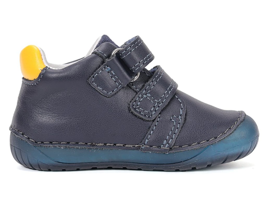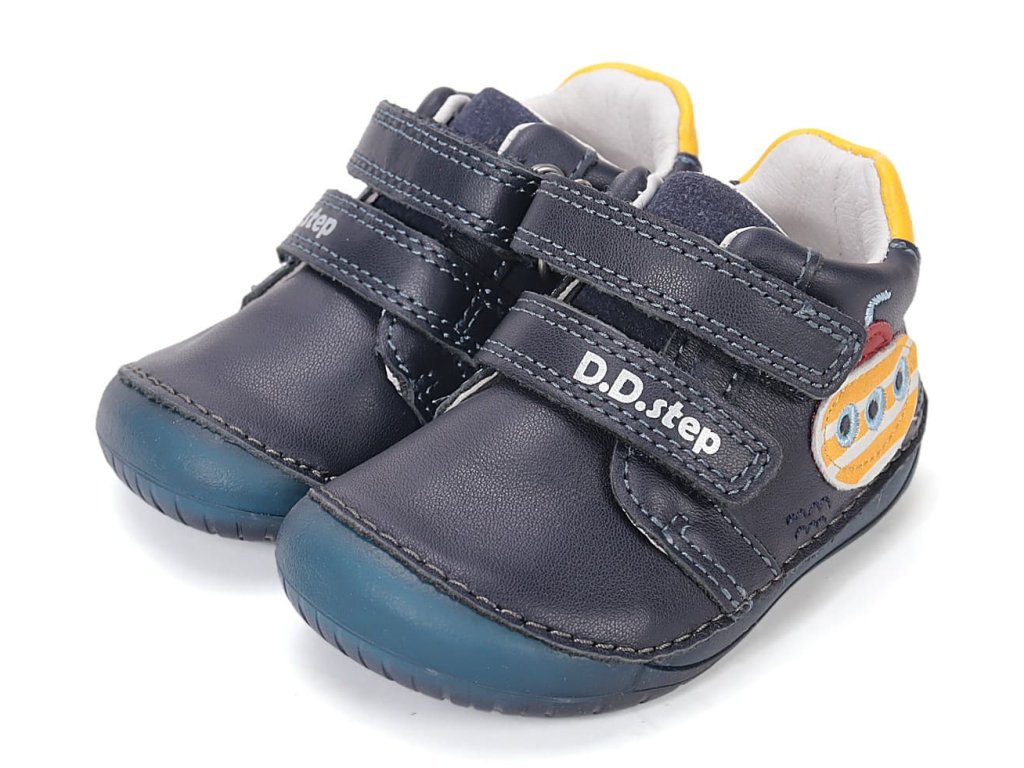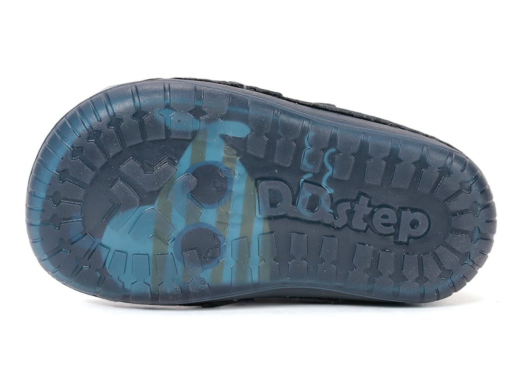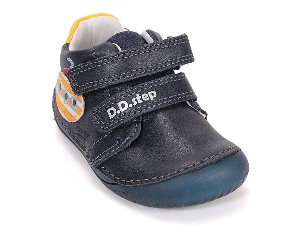 DD Step S070-61420 Royal Blue - chlapecké barefoot boty vhodné na širší nožky. Z praktické hladké kůže v modré barvě s motivem ponorky na boku. Široká přední část a výborně tvarovaná špička i pro dominantní palec (tedy případ, kdy je palec delší než ostatní prsty).