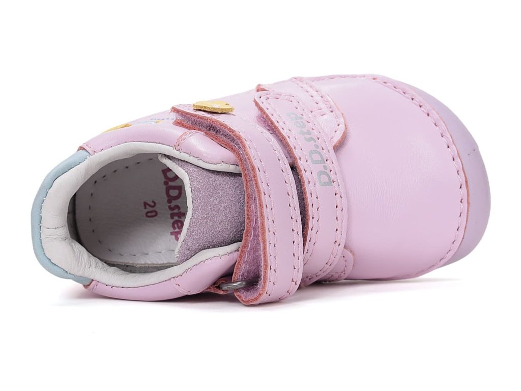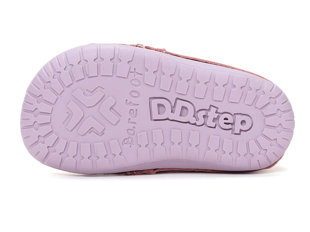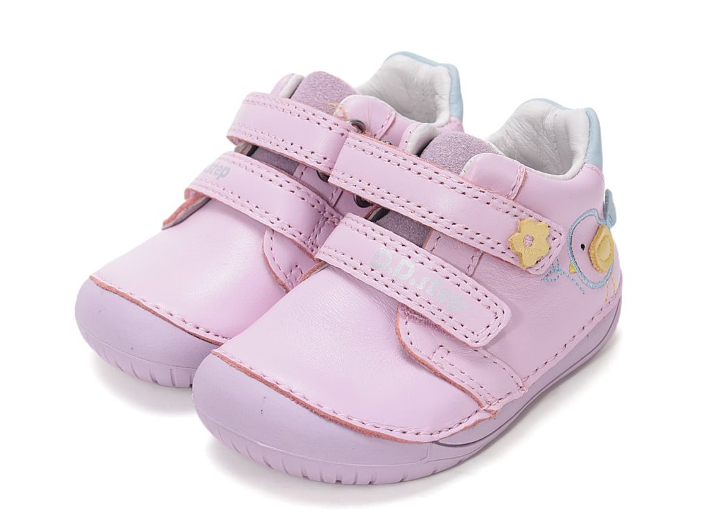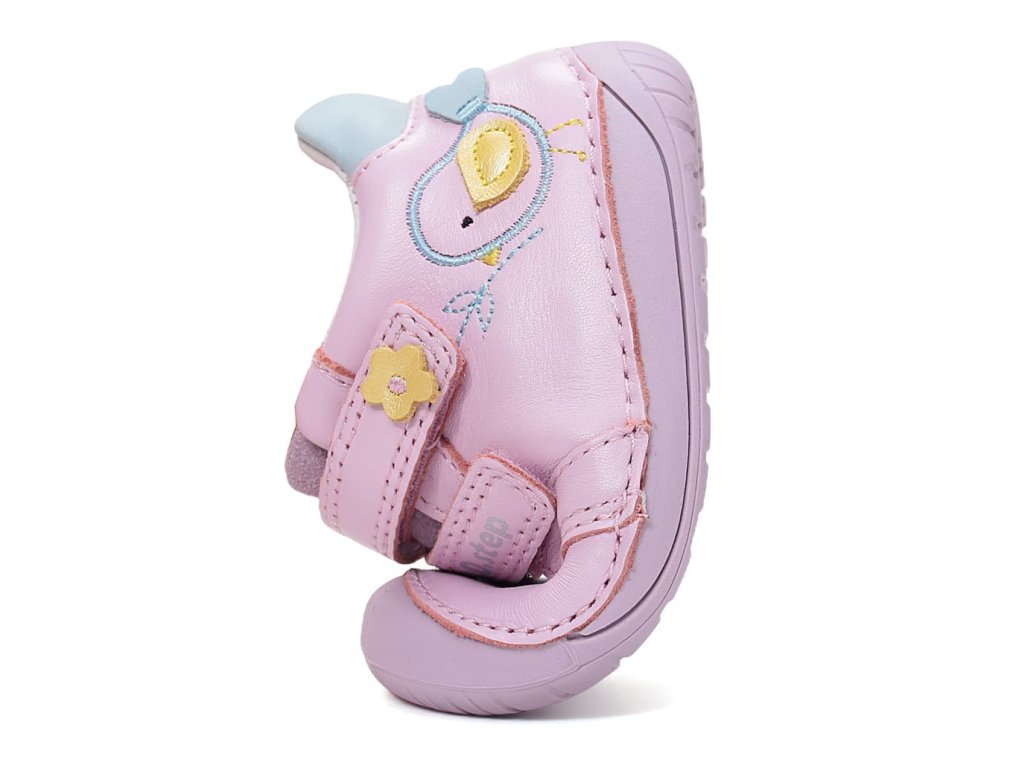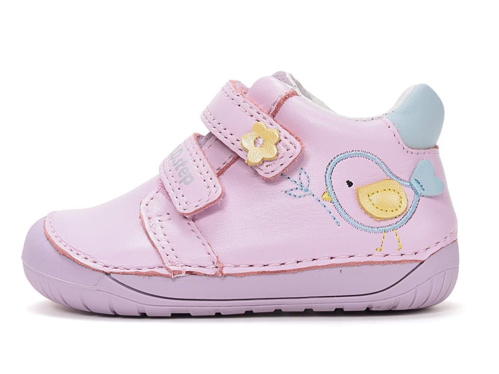 DD Step S070-61646A Daisy Pink - dívčí barefoot boty vhodné na širší nožky. Z praktické hladké kůže v růžové barvě s ptáčkem na boku. Široká přední část a výborně tvarovaná špička i pro dominantní palec (tedy případ, kdy je palec delší než ostatní prsty).