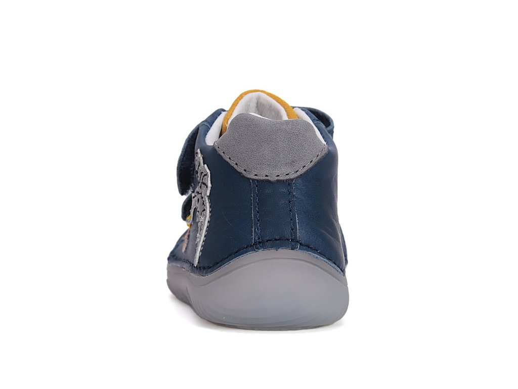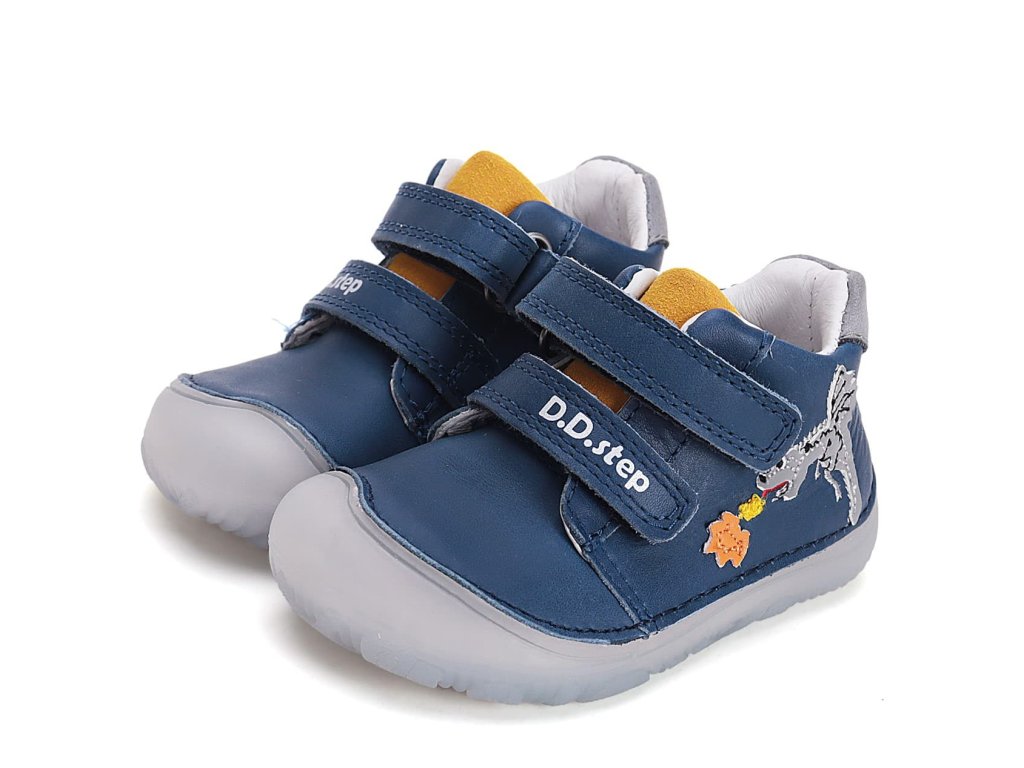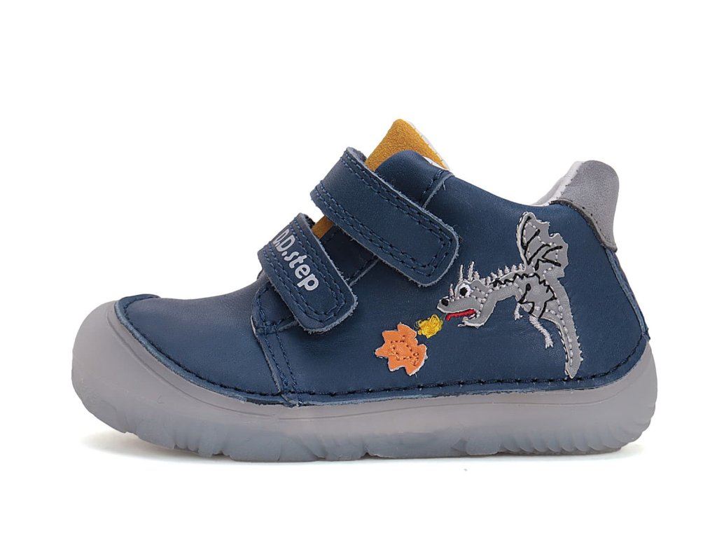 DD step S073-51696A Bermuda Blue jsou barefoot boty vhodné na široké nožky. Tmavě modré boty s motivem draka na boku. Širší přední část a výborně tvarovaná špička i pro dominantní palec (tedy případ, kdy je palec delší než ostatní prsty).