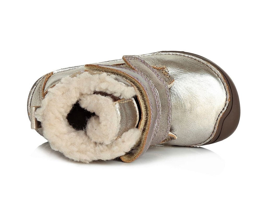 Nové barefoot zimní boty DD Step 073 - nejohebnější a nejvíce barefootová bota od DDstep. Nová řada 073 je tvarově velmi podobná 063, je ale výrazně širší - viz rozměry níže v popisu. Konkrétně DDstep W073-29C Bronze je v "Champagne" odstínu (hladká kůže) v kombinaci s částí s hvězdičkami kolem kotníku z broušené kůže. Boty jsou celokožené, končí až výše nad kotníkem. Uvnitř celé boty je teplý kožíšek.