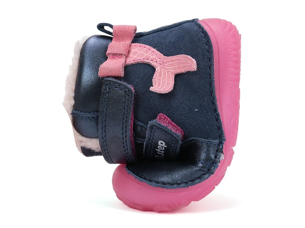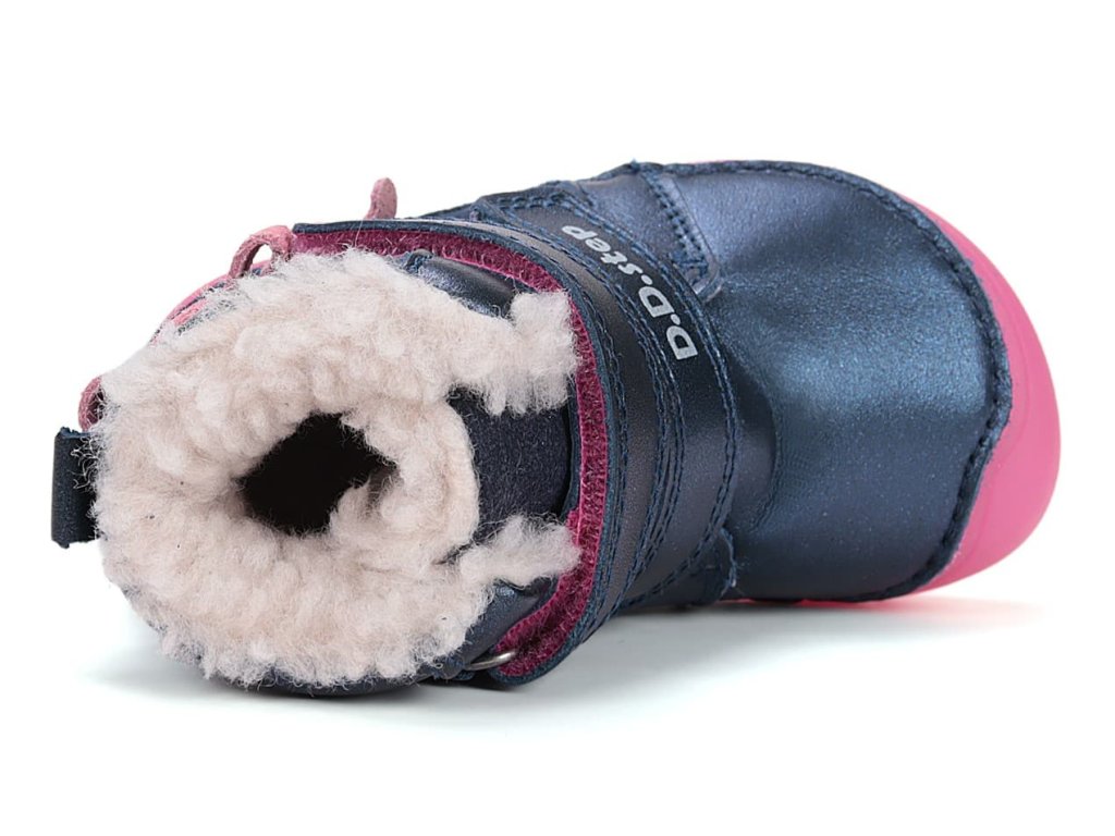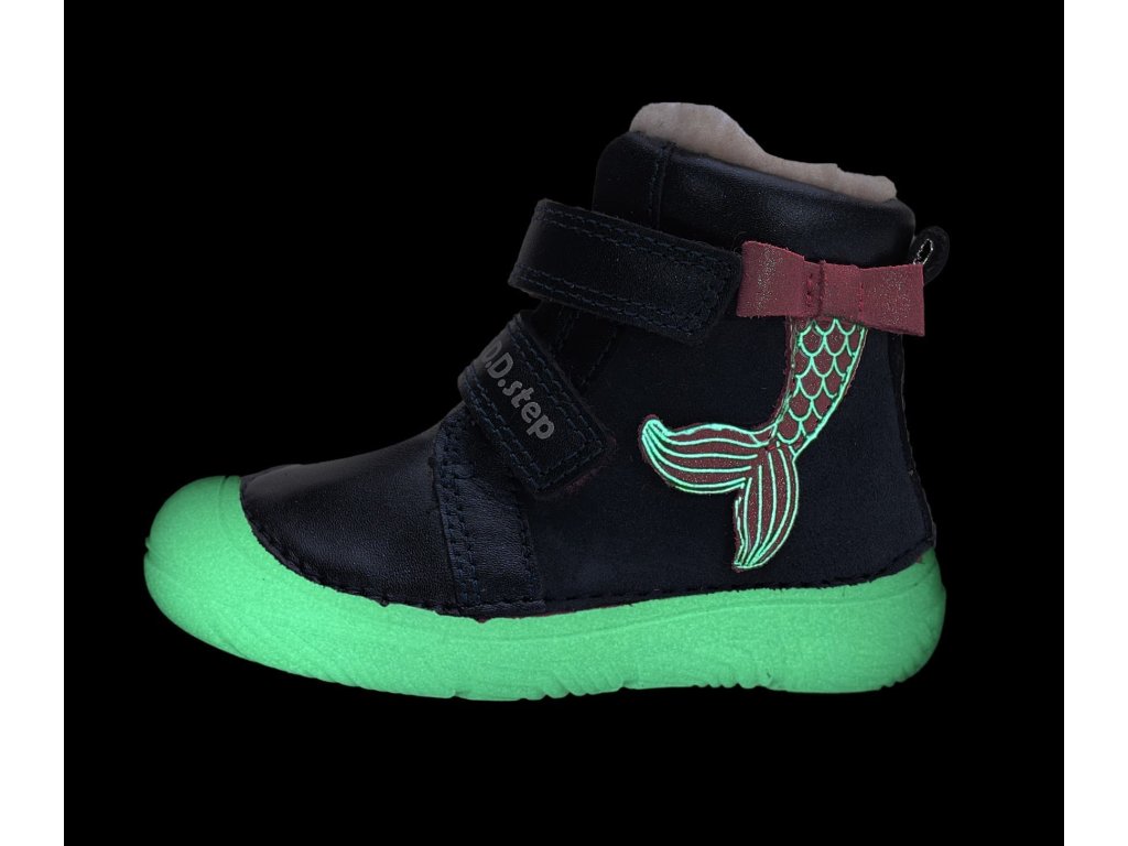 Dívčí barefoot boty D.D. Step W073-52684 Royal Blue/ třpytivá modrá barva s růžovými detaily a růžovou mašličkou ve stylu mořské panny. DD Step 073 - nejohebnější a nejvíce barefootová bota od DDstep. Řada 073 je tvarově velmi podobná 063, je ale výrazně širší - viz rozměry níže v popisu. Boty jsou celokožené, končí kousek nad kotníkem. Uvnitř celé boty je teplý kožíšek. Navíc boty ve tmě fosforově svítí!