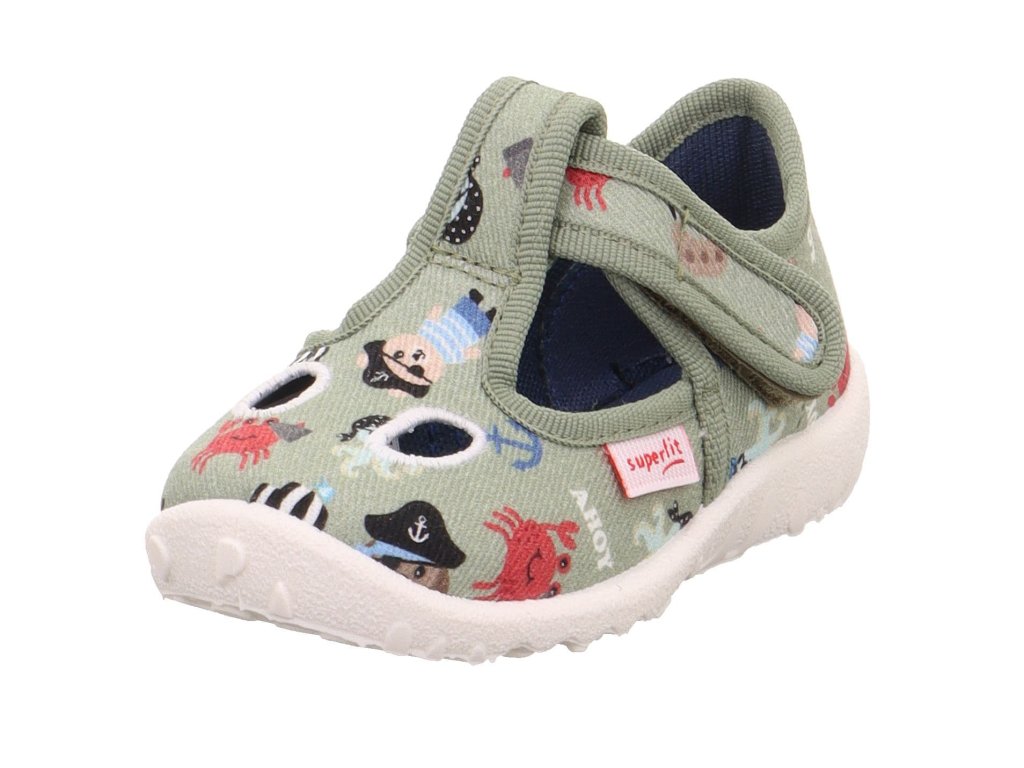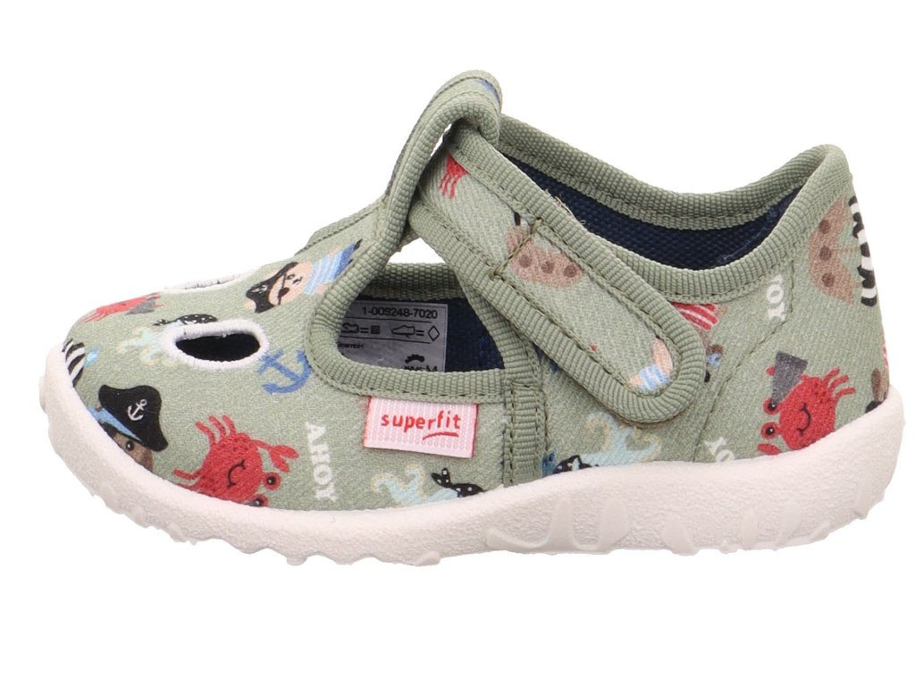 Dětské bačkory Superfit Spotty 1-009248-7020 Hellgrun v zelené barvě s motivem pirátů. V nártové části mají dva praktické otvory pro lepší prodyšnost.