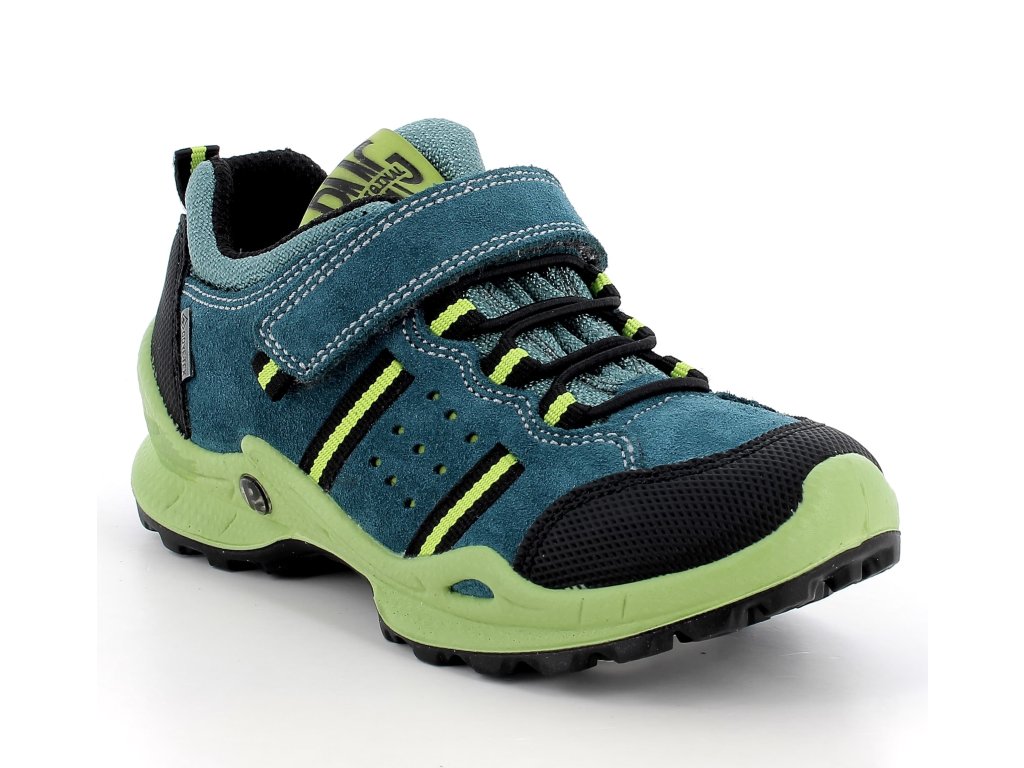 Outdoorové chlapecké boty Primigi 1378922. Broušená modrá kůže s kontrastními zelenými detaily a gumovými ochranými prvky na špičce a patě. Odolná a lehká podrážka s hrubým vzorkem. GoreTex membrána zajistí nepromokavost a zároveň prodyšnost, takže udrží dětské nožky v suchu a pohodlí.