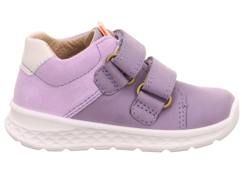 Celoroční kožené boty Superfit Breeze Lila 1-000374-8520 ve fialové barvě. Přední část z nubuku, zadní z veluru (oba materiály jsou přírodní kůže, jen vždy jinak upravená) k tomu jemná perforovaná kožená podšívka z hladké nappa kůže. Nubuk kůže vyniká svojí vysokou kvalitou zpracování, pevností a jemným povrchem. Velour má naopak svůj povrch hrubší a případné nečistoty se dají "na sucho" kartáčkem poměrně dobře odstranit. V kombinaci s nízkou hmotností se model Breeze velmi dobře nosí.