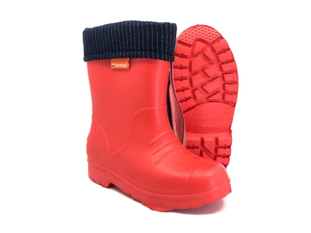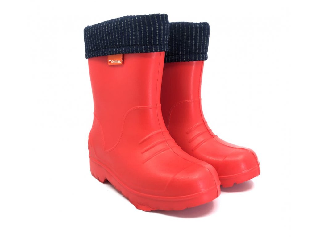 Kvalitní dětské gumáky Demar Dino, vyrobené z lehoučké EVA pěny. Holínky mají vyjímatelnou vložku, jsou tedy vhodné i na chladnější podzim. Ve výrazné červené barvě. Vhodné spíše na užší, hubenější nohu.